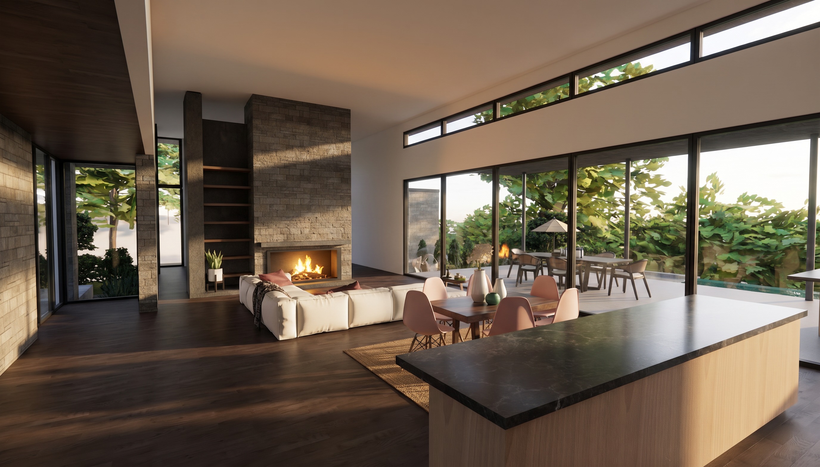 add interior can lighting and a modern chandiler over the dining area replace dining chairs with better ones make trees outside look more realistic make island cabinets more realistic using modern slab cabinets make wood floor lighter and add pictures and other items to shelf next to the fire place