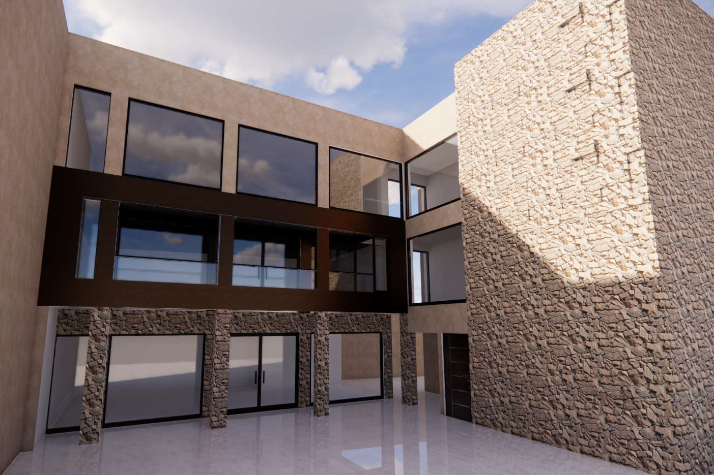 preserve exactly the original structure volumes proportions openings and composition of the building upgrade all materials to highly realistic physically based materials natural irregular stone cladding with varied tones warm beige light brown subtle gray no visible repeating pattern softened joints realistic depth smooth stucco plaster walls with subtle texture variation and imperfections dark metal or wood look cladding with natural grain and slight roughness realistic glass with proper reflections transparency and interior depth use natural daylight realistic sun angle soft shadows global illumination and accurate scale clean architectural photography style neutral color balance no stylization no redesign no added elements ultra realistic