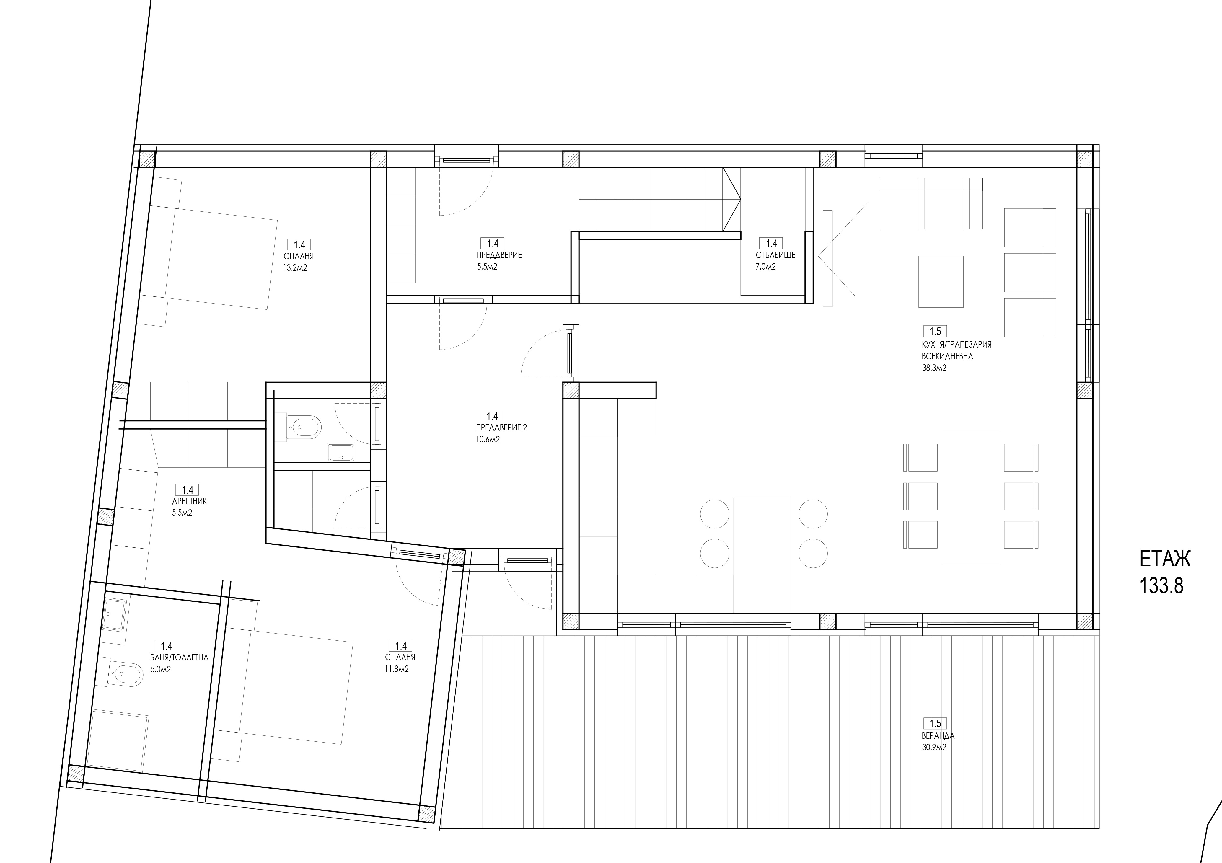 convert this floor plan into a realistic isometric 3d view of a full house show the space from an elevated angle with furniture walls and details visible contemporary urban house japandi style same style as the previous use the same furniture as shows on the plan do not change the orientation of the floorplan