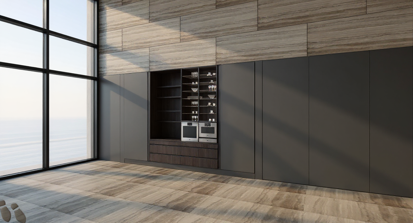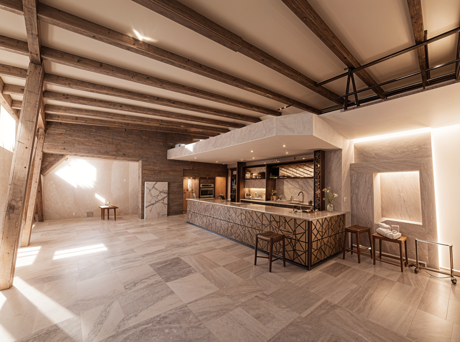 use moder beige and white style with parqetue flooring add some details as dsihes and ceiling lamps