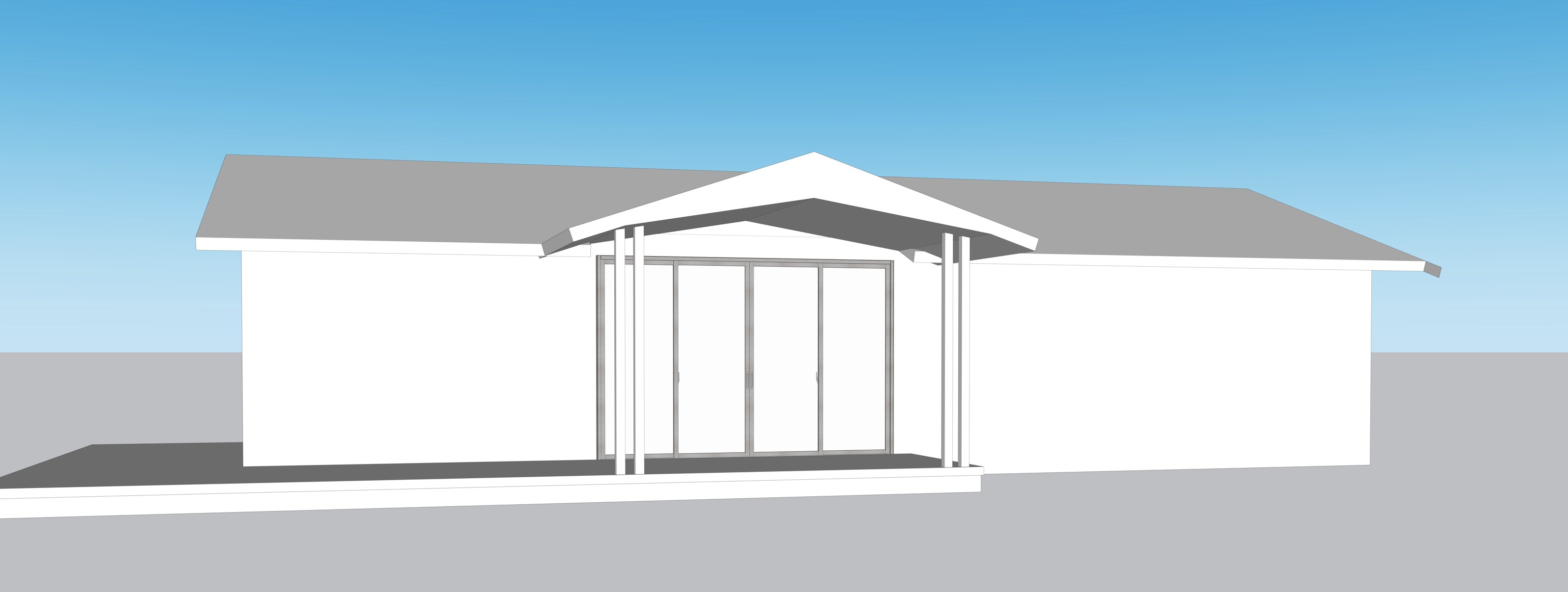 modern architectural style cabin to be constructed at rim rock az overlooking a desert canyon add windows on both sides of the sliding glass doors asphalt shingles charcoal color sand finish light gray stucco walls december 19th at 4pm clear sky