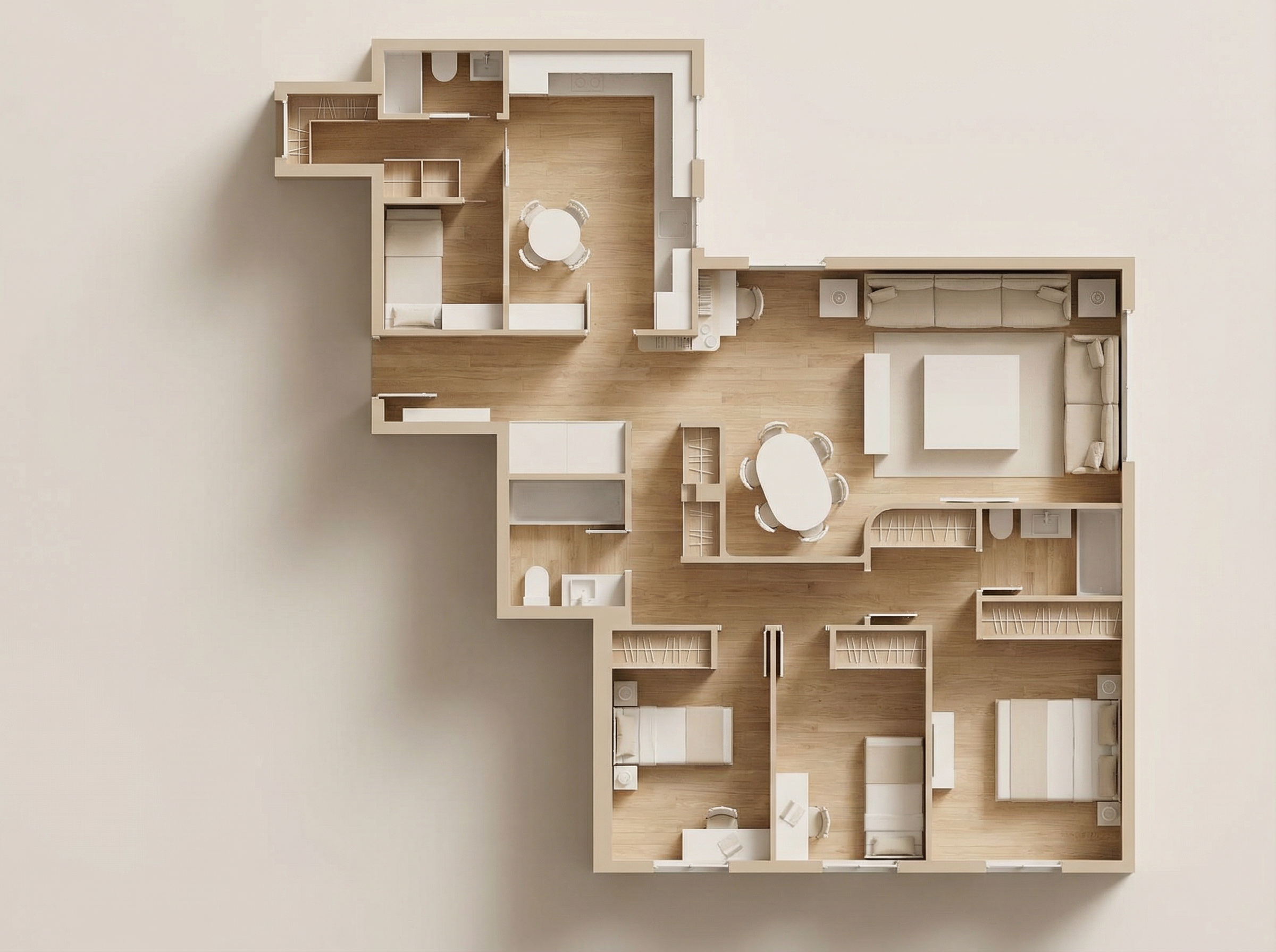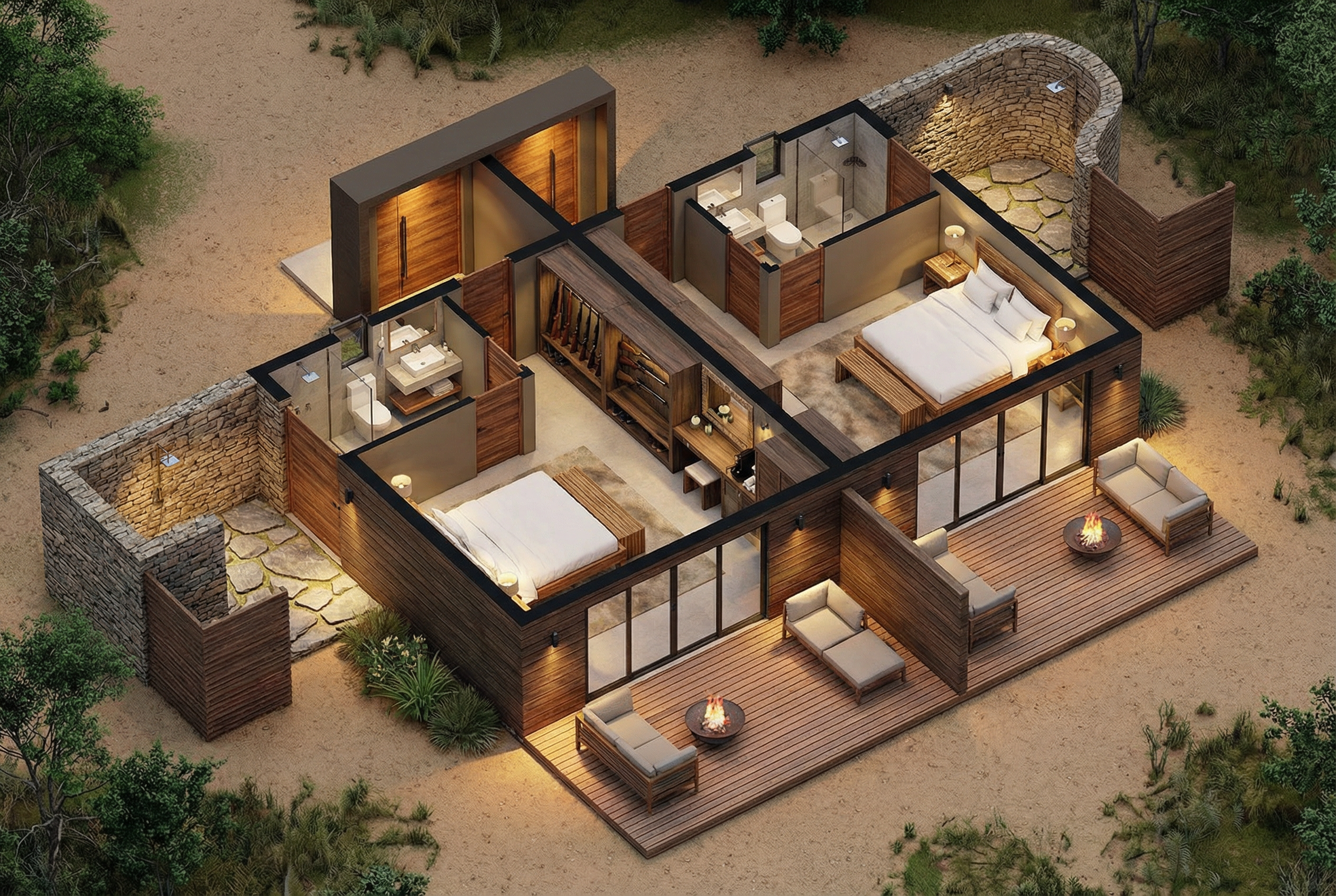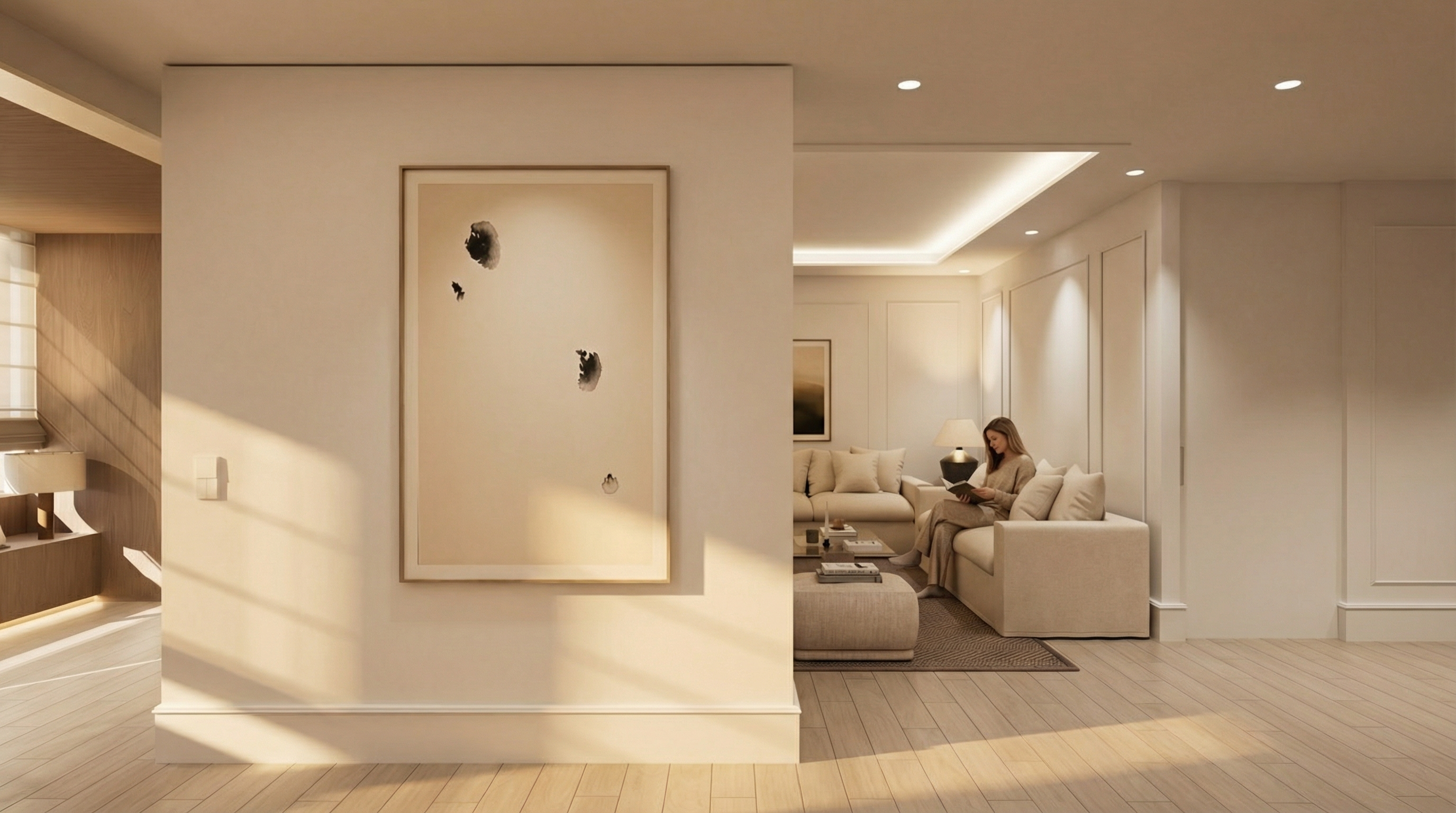 exterior shot create a serene and elegant interior space featuring a modern hair salon and lounge incorporate a neutral color palette of cream bone oak and clay highlight a plush beige salon chair with a sleek curved design and a white ceramic washbasin the walls should be a soft oak shade complemented by natural wood textures add a striking vertical wooden slat feature in a warm clay color as a backdrop in the lounge area include soft white ambient lighting that casts a gentle glow throughout the space use decorative elements like translucent glass vases in soft blue and green hues for a subtle pop of color incorporate plush white seating and a light cream rug for a cozy atmosphere ensure the environment feels warm and inviting perfect for relaxation and self care