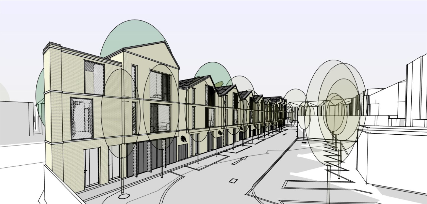 richard rogers exterior shot yellow or buff brickwork standing seam zinc roof surfaces and dark grey windows residential mews style street view in london architecture