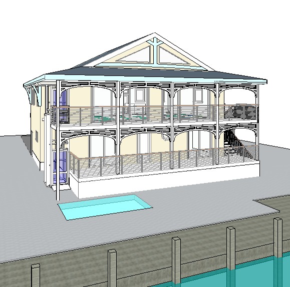 the walls are pale yellow the detail at the roof peaks should stay their present color all other trim work to be white the roof is a pale teal metal roof the home is situated in a tropical setting with puffy clouds and palm trees nearby the photographer is looking at the house across the dock to the yard which has a small pool as depicted