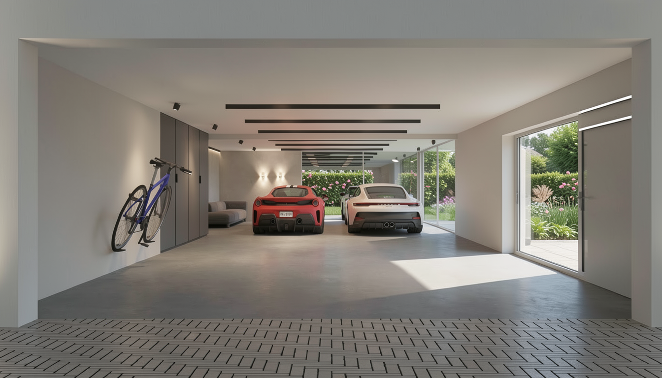 natural daylight simple garden as background brown grey wood open staircase with metal sides and wooden steps keep materials and proportions