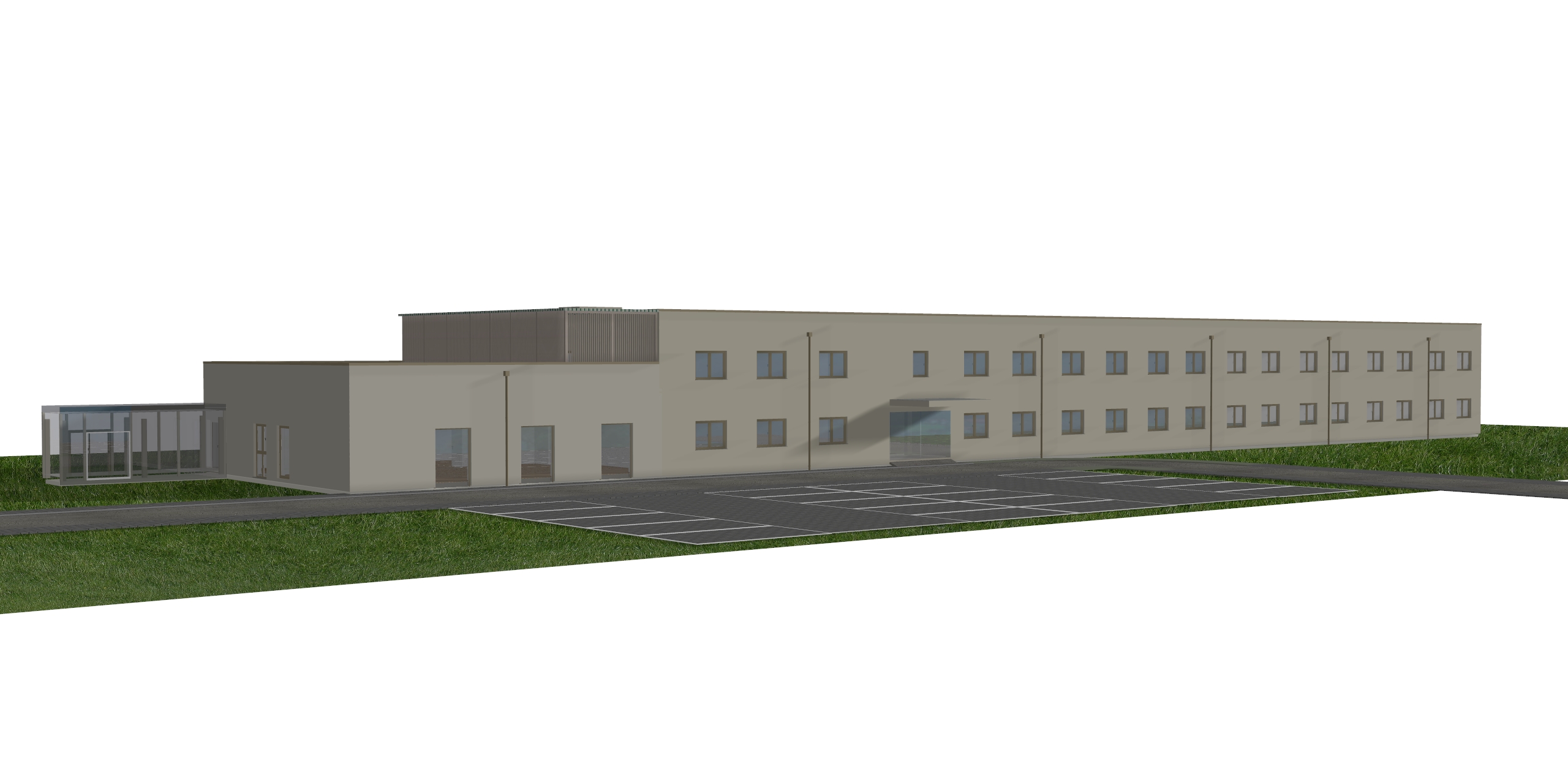 render a modern industrial building with a sleek minimalist design the building exterior should have a smooth beige facade with large windows reflecting a soft blue sky the roof should incorporate elements of light gray and metallic accents for a contemporary touch surround the building with a lush vibrant green lawn and a neatly paved parking lot with defined lines create a bright and inviting atmosphere with natural daylight casting gentle shadows for a serene yet professional setting