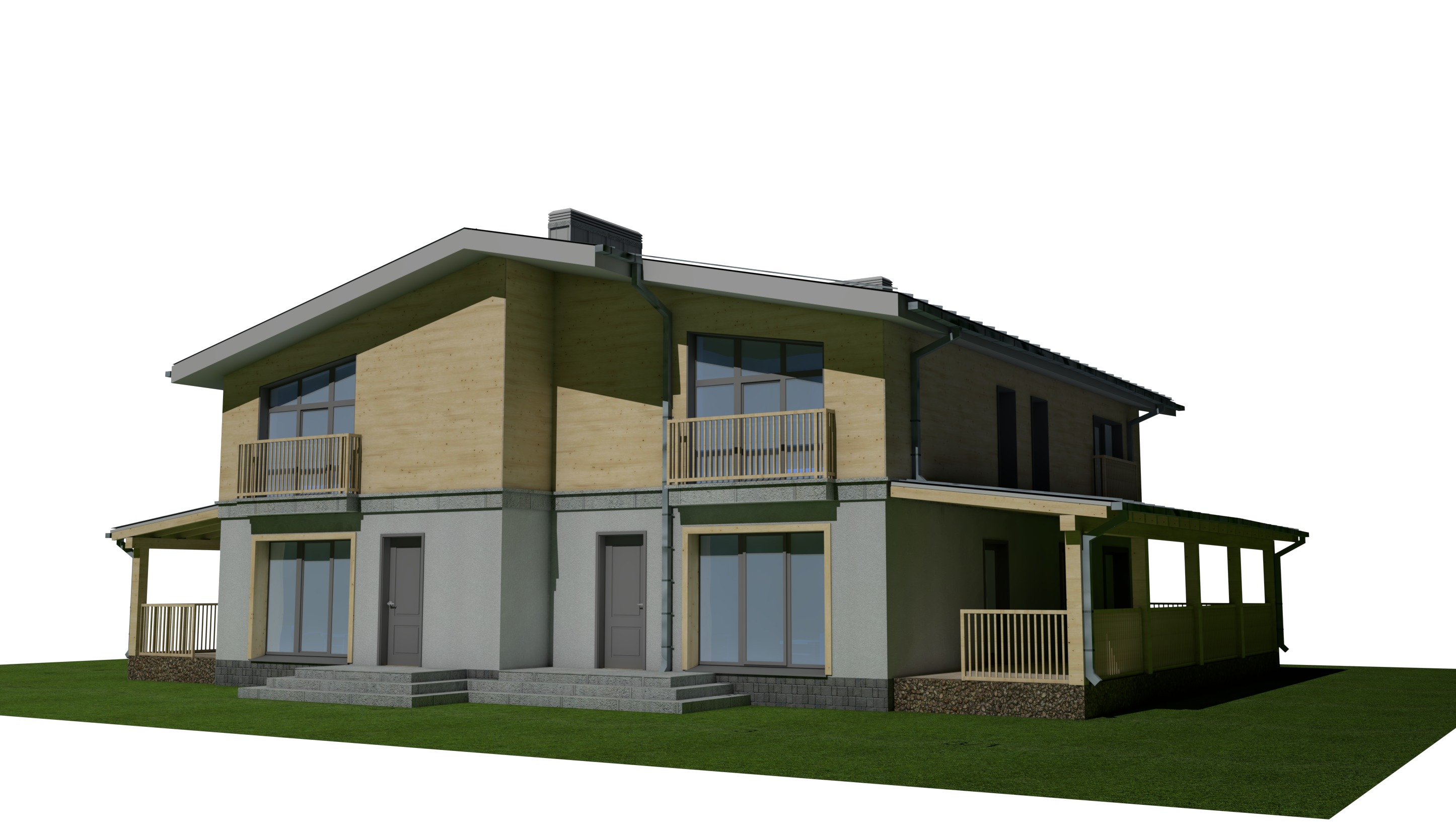 render a modern two story house with a natural wood facade and light gray concrete accents the roof is a sleek dark gray with matching gutters large windows reflect a clear blue sky set the house on a lush green lawn under a bright and sunny atmosphere add soft shadows to create depth and dimension