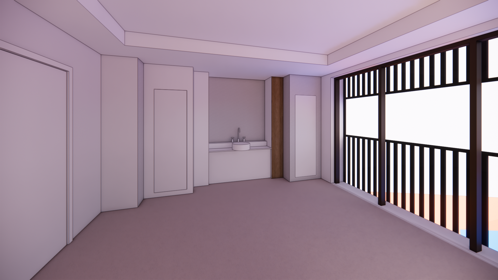 this is a treatment room please add a person lying on the massage bed receiving a massage and another person giving the massage add a mirror behind the sink and enhance the two mirrors on either side of the sink include lights on the ceiling and create a warm inviting atmosphere with soft lighting outside the glass door there is a pond surrounded by plants and nature