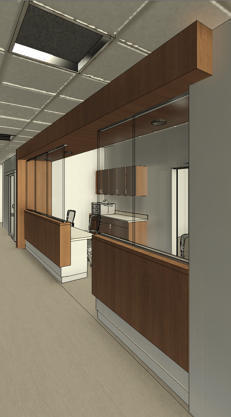 modern nurse station with glass dividers in front of the desk the floor is a blonde wood vinyl plank
