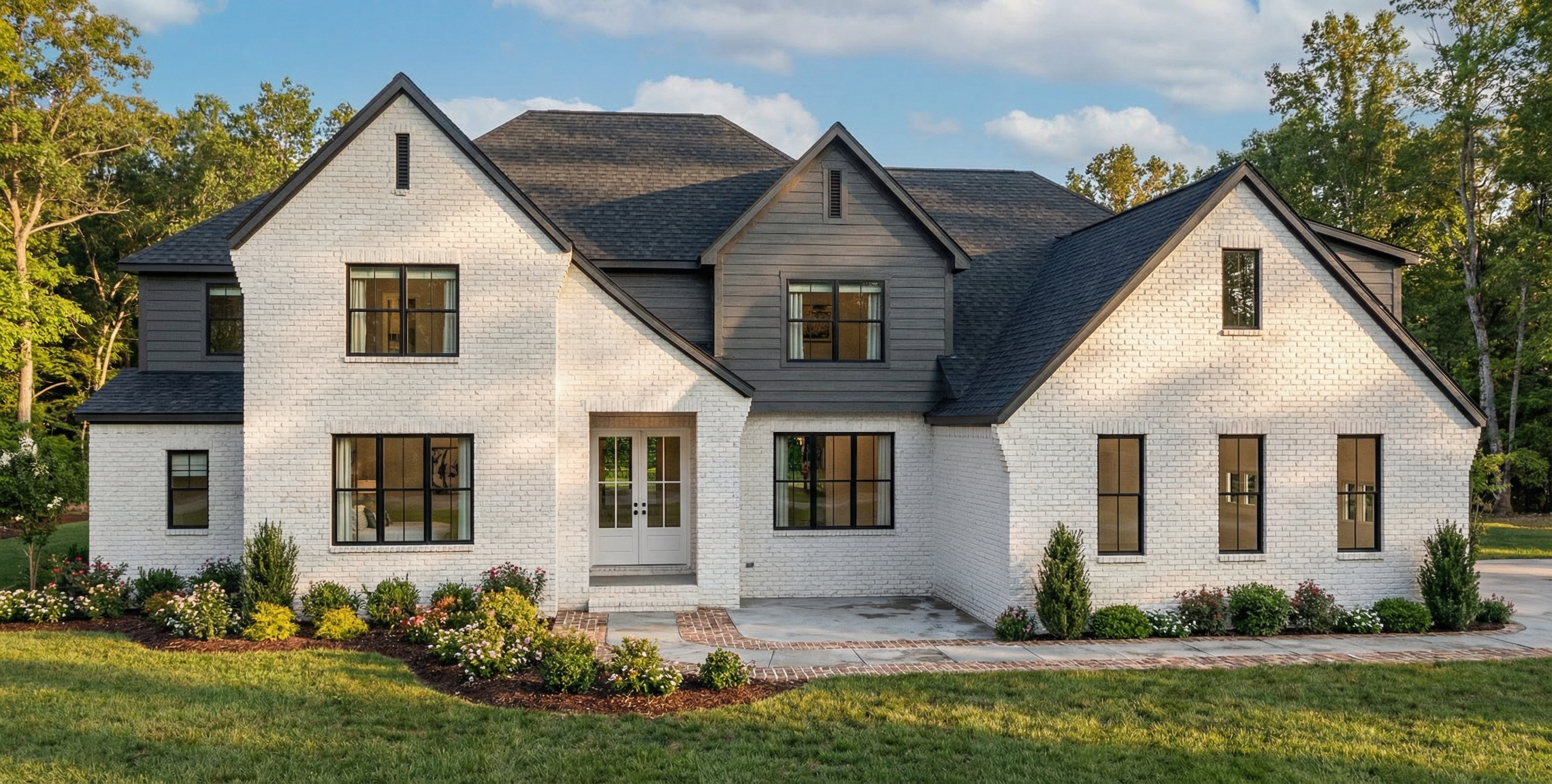 create a photorealistic architectural visualization of the provided building design preserve all original materials colors and architectural details exactly as designed place four smaller trees on the plot each with a maximum height of 3 meters positioned naturally within the site create a vegetated green roof with shrubs only on the flat roof above the garage strictly do not add any trees shrubs plants or vegetation on the main pitched roof with tiled roofing the main tiled roof must remain completely clean and vegetation free use realistic central european slovak vegetation local deciduous trees shrubs natural grass add one realistic passenger car on the adjacent road and two people near the building for scale and realism use natural daylight realistic shadows high material accuracy and a professional architectural photography style camera emphasizing realism and architectural context