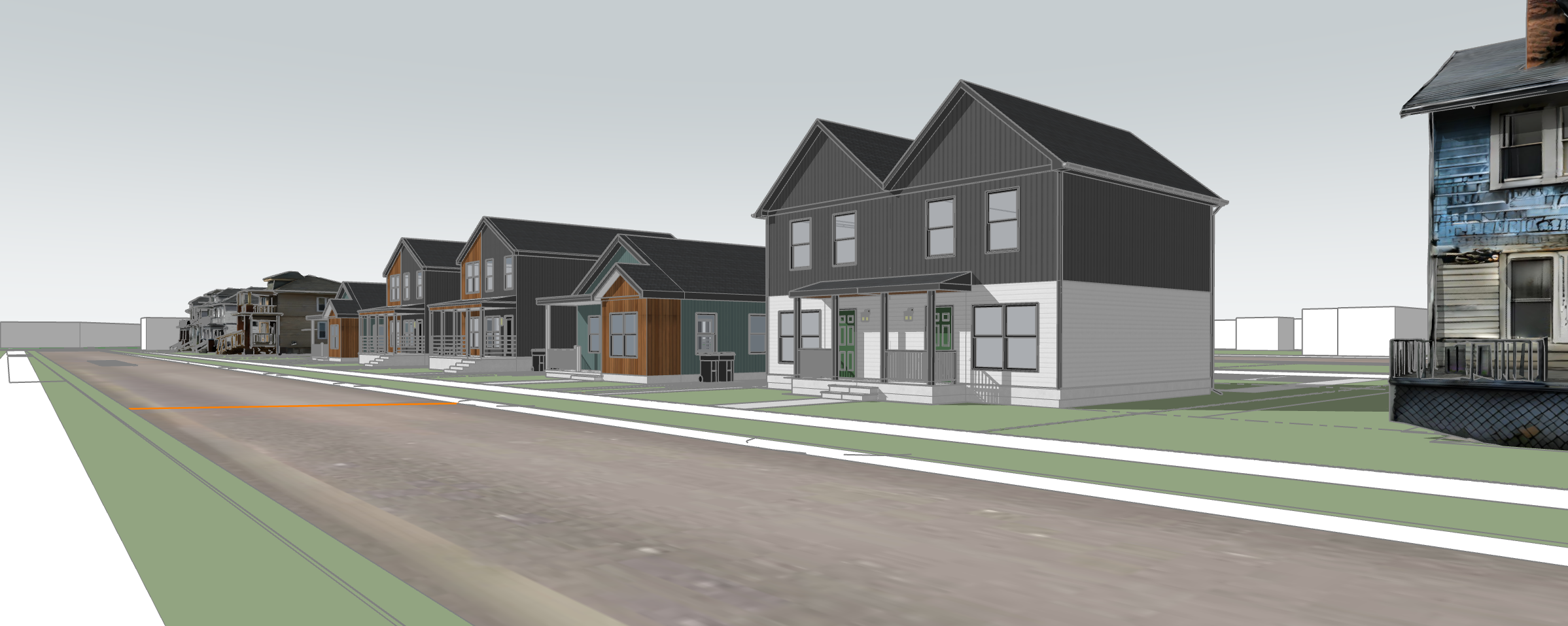 enhance the image to a photorealistic render add trees bushes on the front and sides of houses