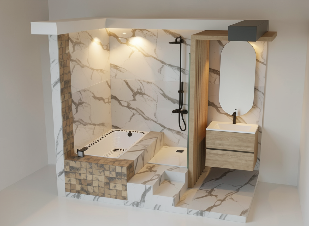 mixed media hybrid style image blending photorealistic rendering and architectural hand drawing that merge into the scene designed to resemble an architect s portfolio board or university presentation panel the entire composition is surrounded by a mixture of cad style and hand drawn architectural annotations technical sketches including section cuts and detail diagrams measurements dimensions and typographic elements clean white studio background with soft shadows and contour lines