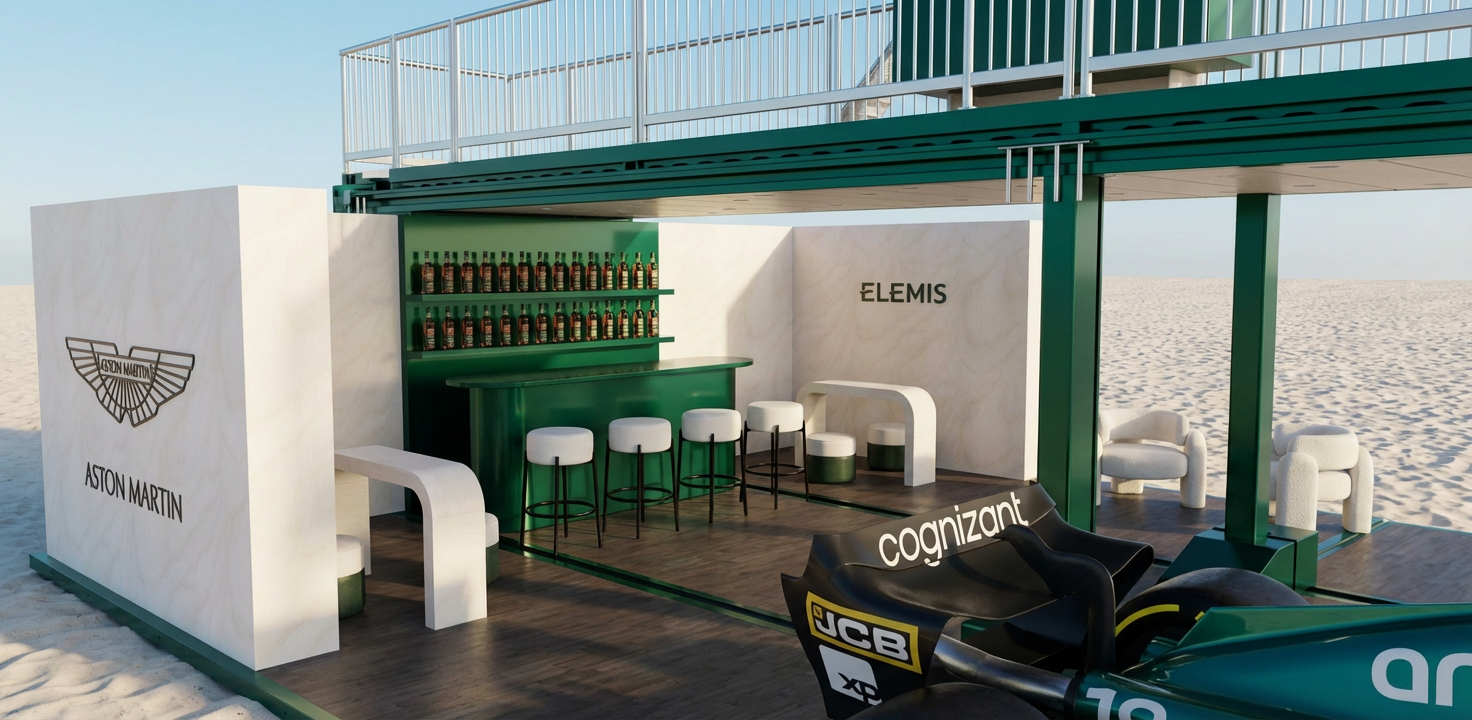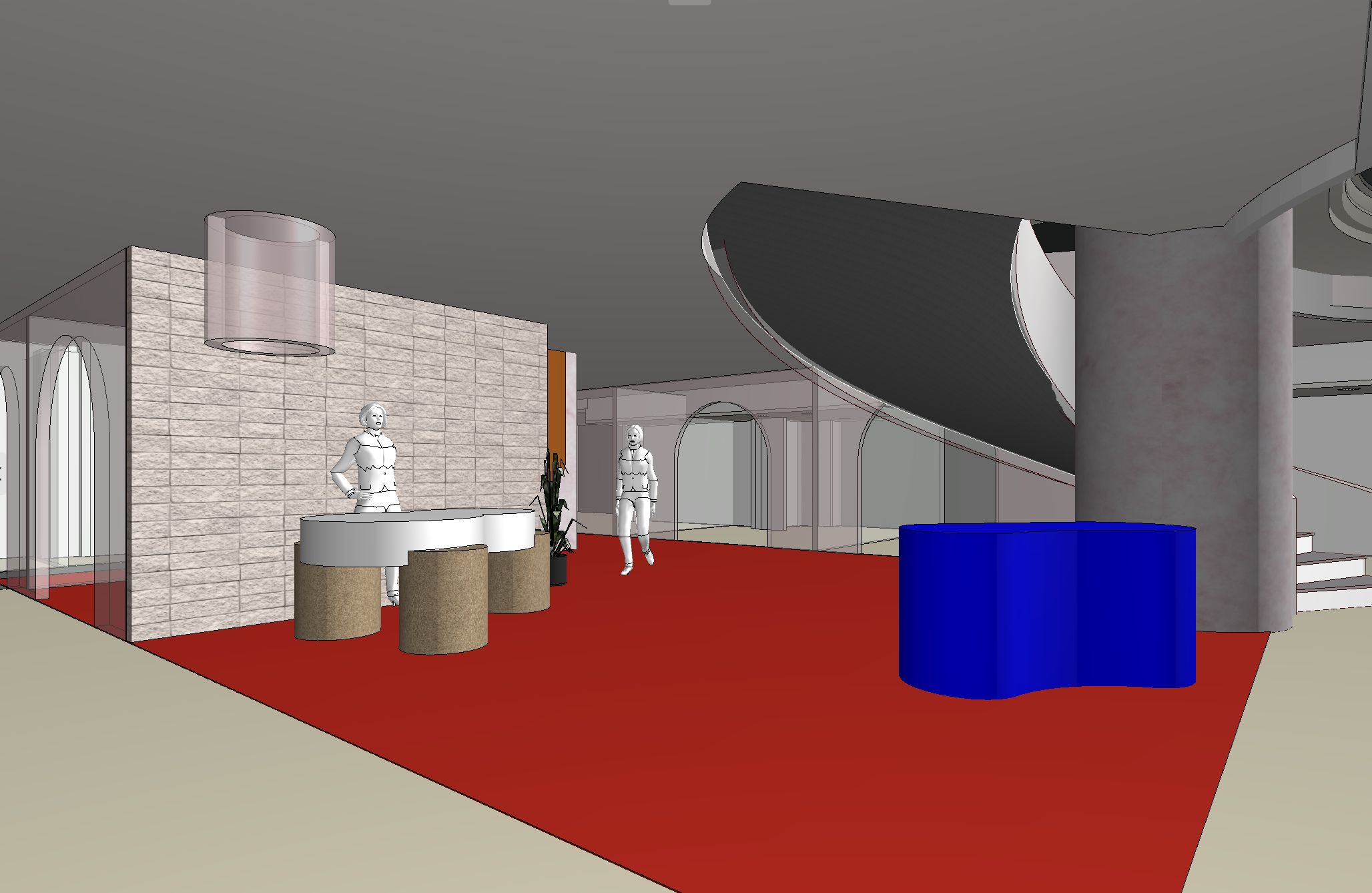 the brick wall should be a white brick textured wall the ceiling cylinder pendant in front of wall should be a light white acrylic with a subtle glow inside the red floor should be a white terrazzo with colourful stones the tabletop in front of brick wall should be a silver mirror finish the legs should be in textured sandstone the round column should be in off white with an upper case neon sign stating skin sanctuary the rooms with arch entries should be in a soft pink glass transparent finish the curved staircase should be in sage green on the ceiling we should see downlights the plant should read as a lush fiddle leaf the people should read as real life females