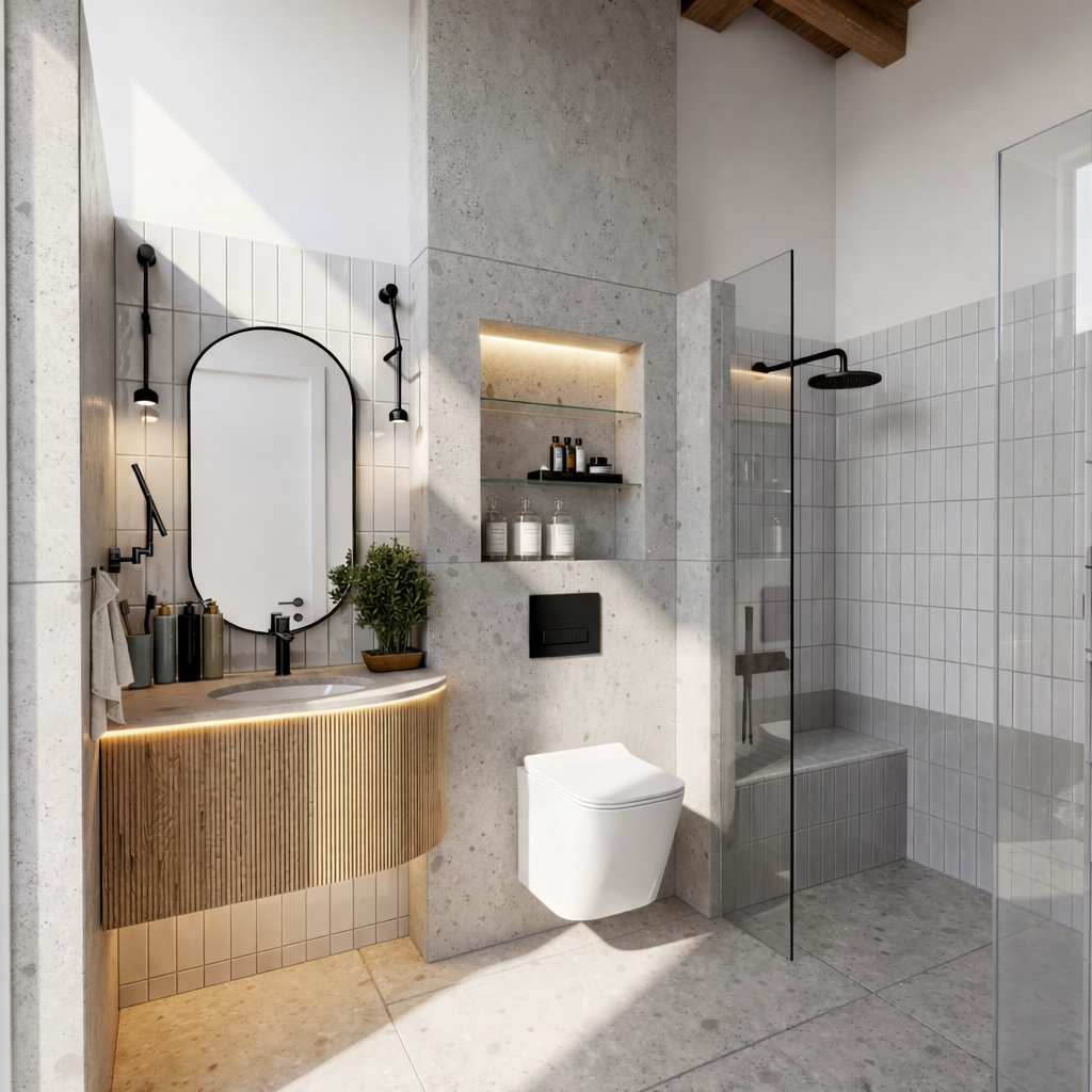 render a contemporary bathroom scene with a serene and elegant atmosphere the walls are adorned in light gray concrete reflecting a minimalist aesthetic the vanity features a textured wood finish in warm oak tones complemented by a modern oval mirror soft ambient lighting emanates from under the vanity casting a gentle glow the black fixtures including the faucets and showerhead add a striking contrast the white toilet and neatly arranged toiletries on glass shelves showcase modernity and cleanliness incorporate lush greenery for a touch of nature the overall lighting is bright yet soft enhancing the calm and refreshing vibe