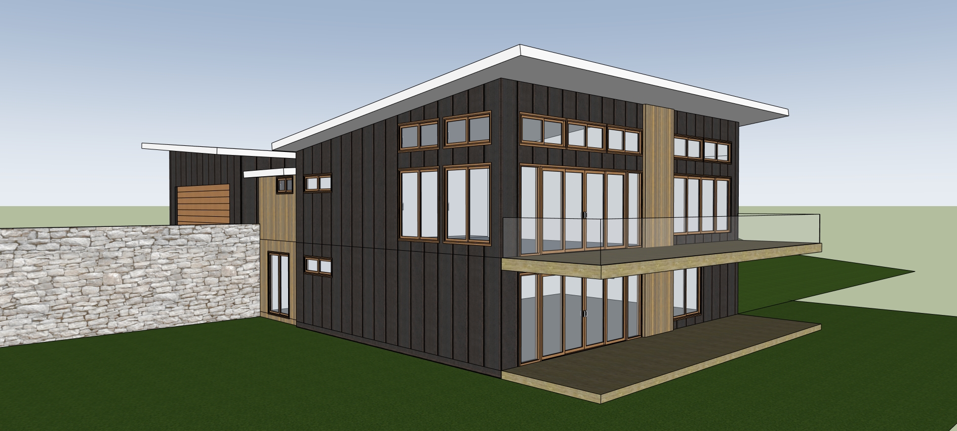 this is a residential project in nsw australia the lot is with steep slope so the rear part of the structure is at upper ground level and the front part of the structure has a lower ground level the exterior cladding are all board and battens in black paint finish with vertical wood boards accents in oak finish as shown change the window and door frames color to black the balcony at the upper floor is off hardwood deck with glass railing all around and the lower deck is of the same hardwood material the site sits on a lush grass area with views of forest