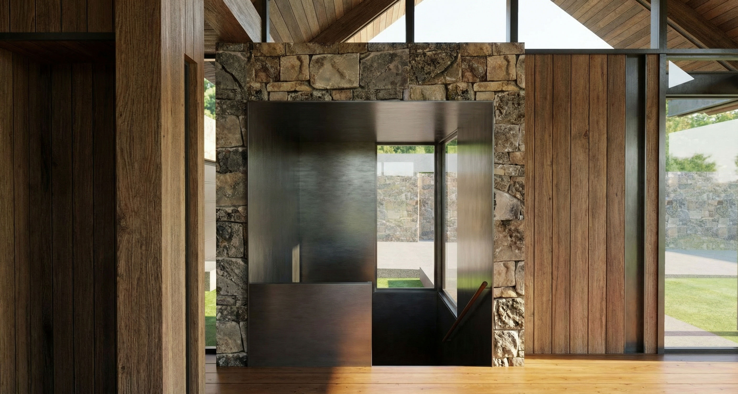 add two story deck on building both buildings and make buildings black black windows add porch on center building