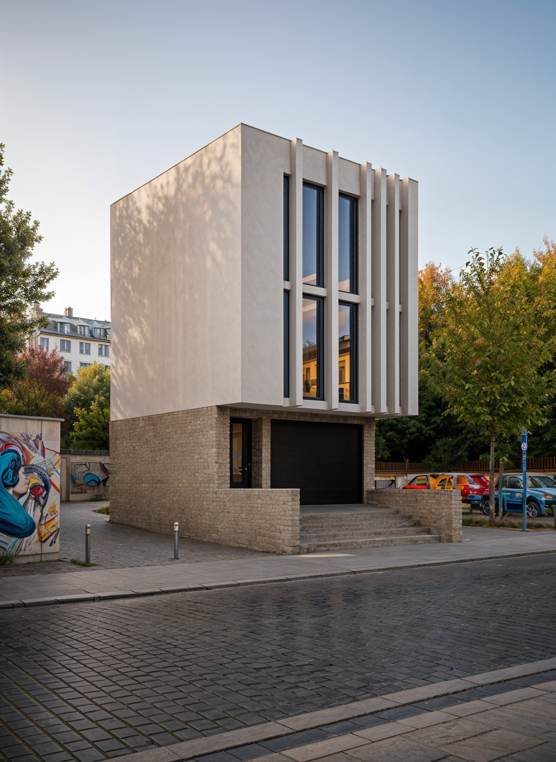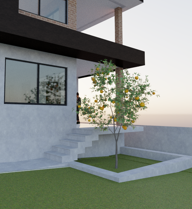 use the reference image as base maintain the architecture exactly as shown only redesign and refine the staircase platform and planter around the orange tree modern minimalist residential building with smooth polished concrete facade the large horizontal frame on the second floor is polished concrete painted matte black creating a strong modern architectural element at the entrance there is an existing orange tree that must be preserved and emphasized as the focal landscape feature redesign the stairs and entrance platform to feel more intentional and integrated with the architecture a clean linear staircase in polished concrete runs parallel to the wall leading to a small entrance platform the platform includes a minimalist metal railing in white or black the remaining space between the stairs and the tree becomes a modern geometric planter integrated into the design the planter frames the orange tree allowing the trunk and canopy to remain visible and giving the tree visual importance at the entrance materials light polished concrete stairs and planter black painted polished concrete architectural frame minimalist metal railing refined landscaping with grass and soil around the tree design intent the orange tree becomes the central element of the entrance composition framed by the concrete stairs and planter creating a modern architectural courtyard feeling lighting soft warm sunset lighting realistic architectural shadows photorealistic rendering high quality architectural visualization v ray style style modern mexican residential architecture minimalism clean geometry architectural competition render