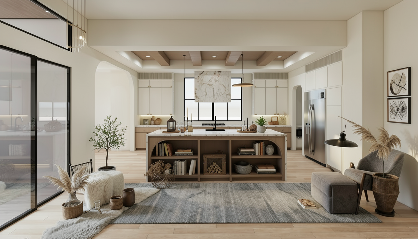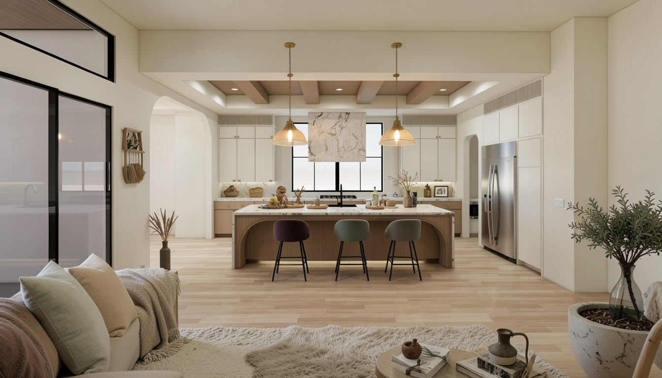 create a serene modern cafe interior with a minimalist design use soft beige for the walls and ceiling contrasting with natural wood elements the seating area features off white sofas and round wooden tables enhance the calming atmosphere with pastel blue tiles on the counter backdrop add contemporary pendant lights in a muted olive tone hanging elegantly from the ceiling display neatly arranged merchandise in a subtle tan color on the shelves design an airy feel with diffused natural light and a harmonious blend of cool and warm tones creating an inviting and cozy atmosphere