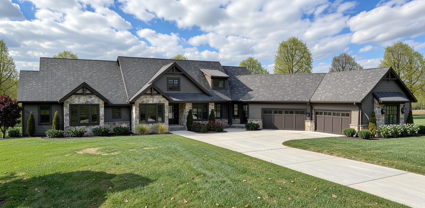 partly cloudy sky some deciduous trees in background add gutters and downspouts