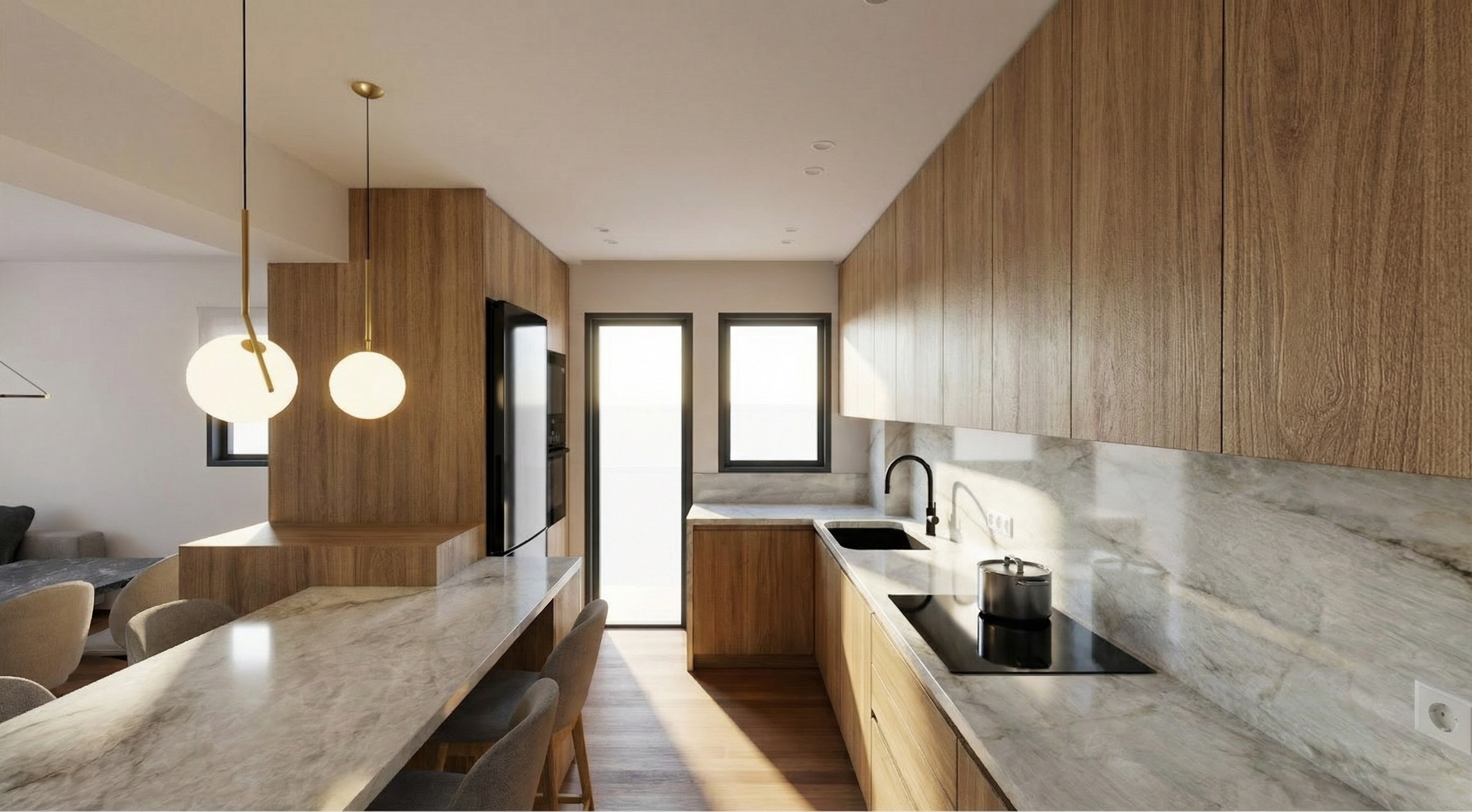 eye level view from a standing human position in front of the building observer standing directly in front of the main fa ade facing the building camera at human eye height 1 6 m straight on frontal perspective building centered in the frame main elevation clearly visible natural walking viewpoint no rotation of the building mass correct architectural proportions realistic scale daylight soft shadows photorealistic architectural visualization high detail