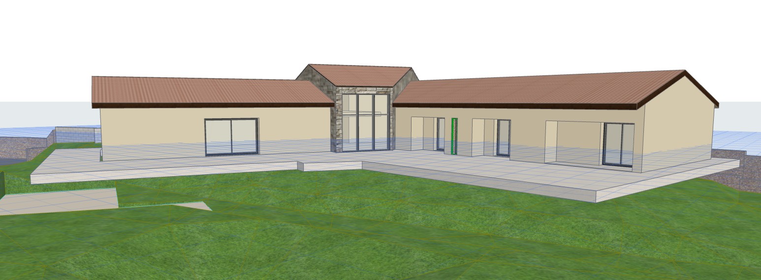 zaha hadid exterior shot render a modern single story house set in a lush green landscape featuring a beige stucco exterior dark brown gabled roof and large glass windows add stone accents to the central entrance surround with vibrant green grass and a clear blue sky the atmosphere is serene and inviting with soft sunlight casting gentle shadows architecture