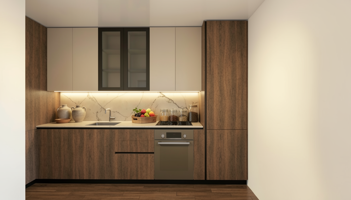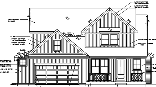 please create a photo realistic rendering of this home in a low country style maintain all architectural design including roof line windows and door the board and batten siding is the color pearl the roof is driftwood shingles the front door is stained walnut the railing is color pearl the garage door facia and gutters are in color champagne the windows are white the landscape is green lawn with shrubs and small planter beds with some privacy trees