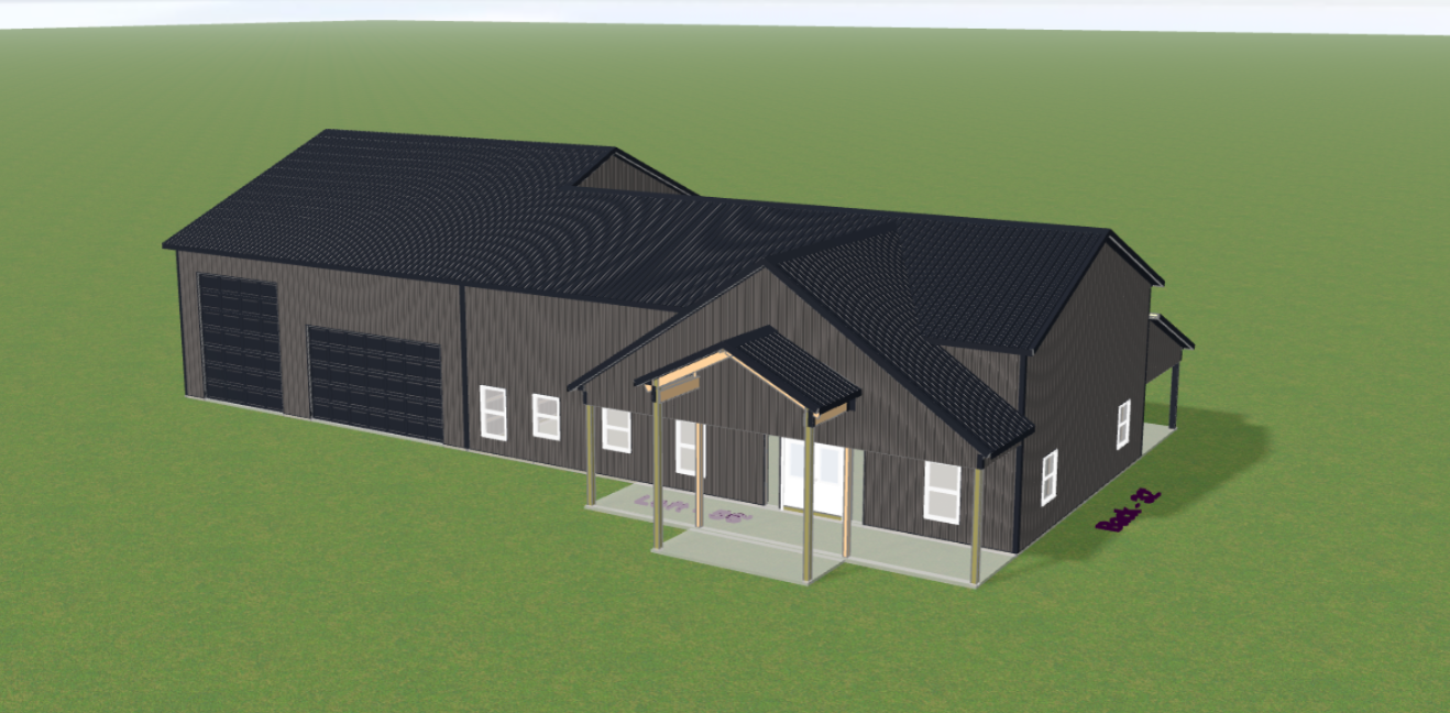 can you make this look more realistic add a driveway to the garage the small front gable truss will get a wood framed timber truss and the porch posts will be wrapped in cedar add some rural trees in the background