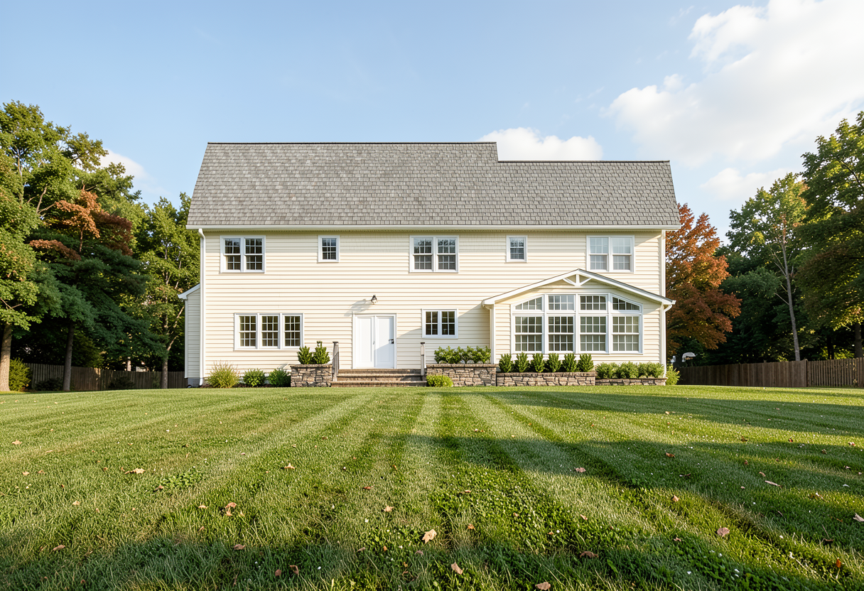 asphalt shingles off white light tan siding with white window frames