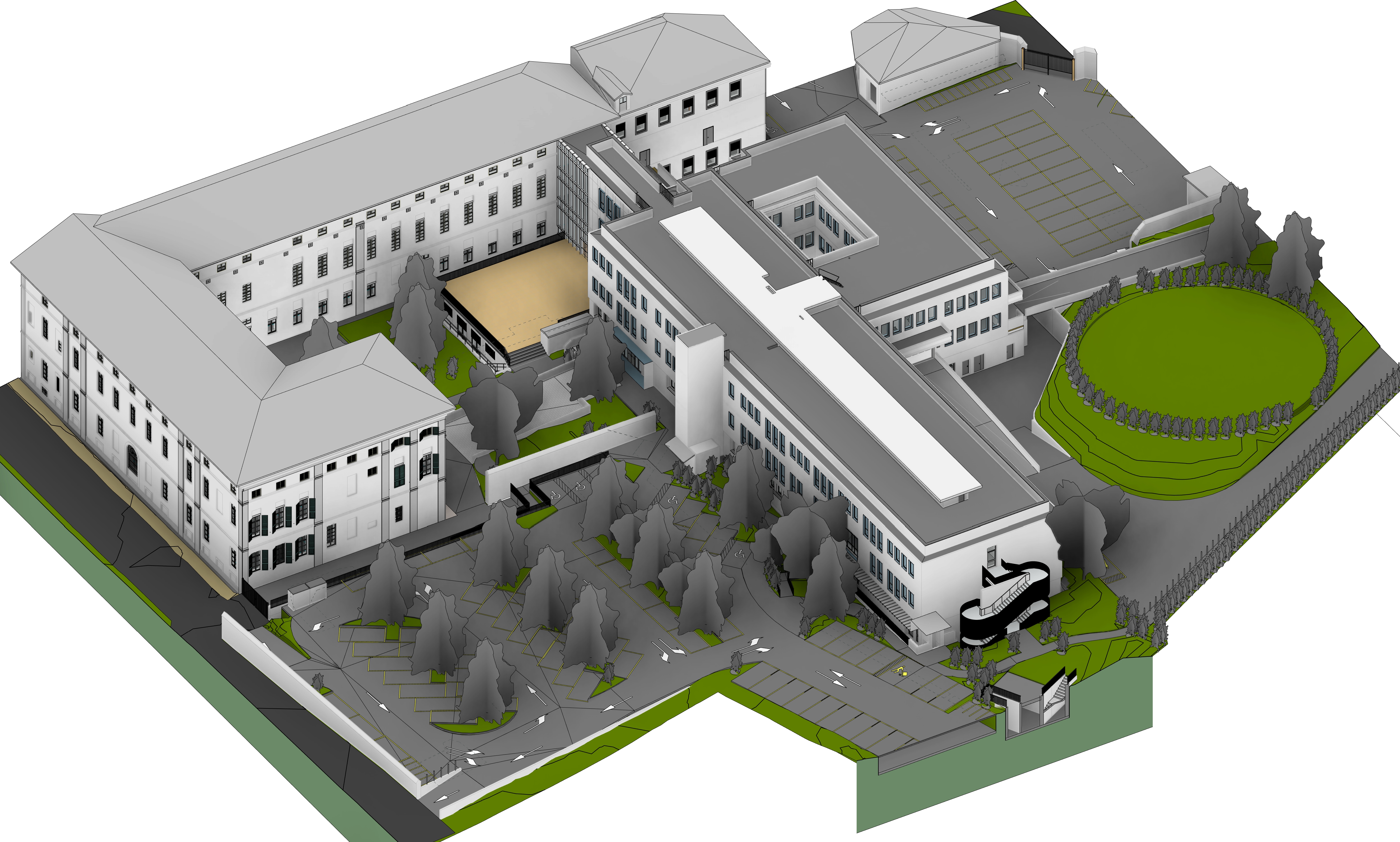 render a detailed architectural scene of a modern hospital in a lush green environment the buildings are white with light gray rooftops large windows and feature classic architectural elements surround the structures with vibrant green lawns and well maintained pathways include a central plaza with well defined contemporary landscaping featuring dark gray paving and scattered mature trees with rich green foliage add a circular grassy area with a ring of small hedges the atmosphere should be bright and welcoming with soft sunlight casting gentle shadows creating an inviting and serene campus ambiance architecture