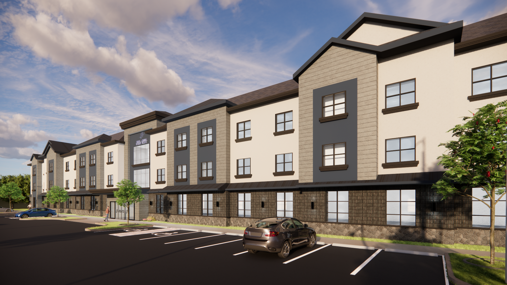 nice weather and red white blue foliage landscaping add a lively scene