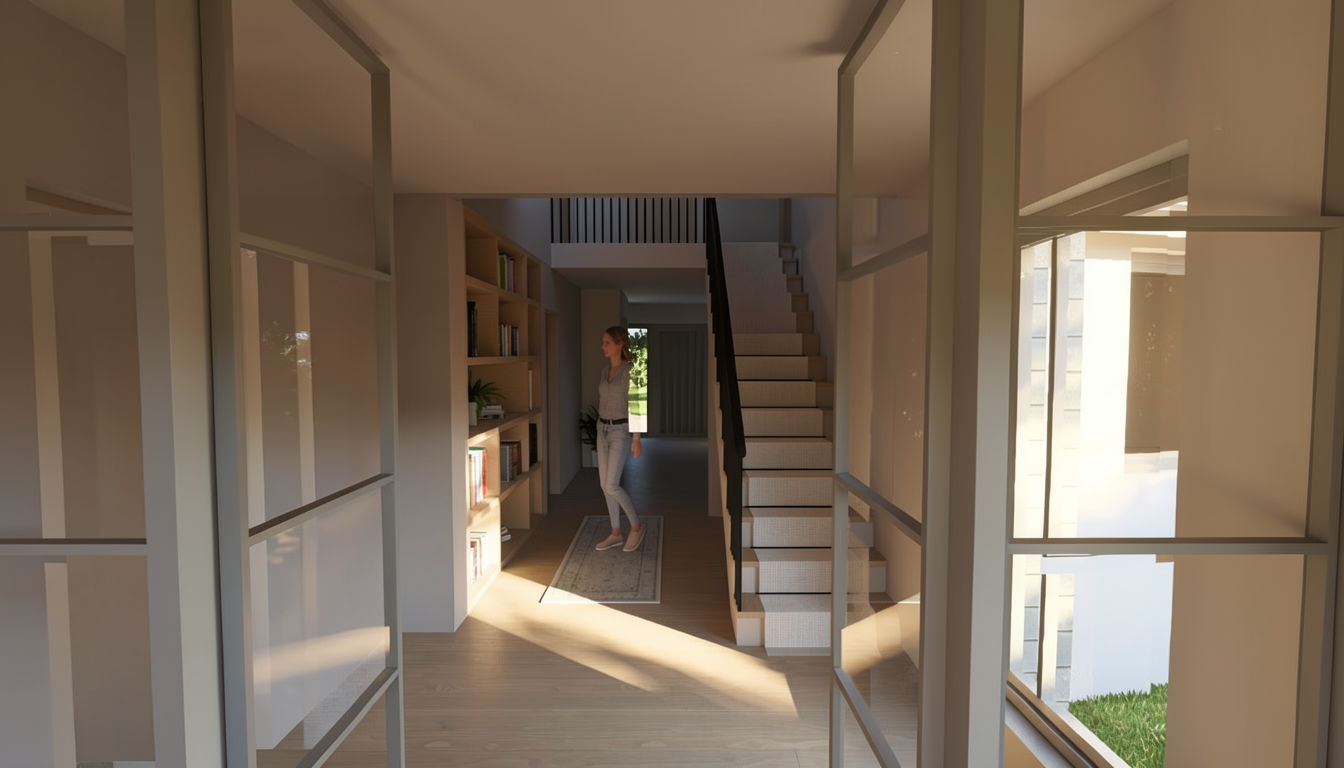 photorealistic render of a modern tropical residence facade in juncos puerto rico golden hour lighting warm sunlight casting long soft shadows tropical landscaping with planters integrated into the architecture on the right side architectural lighting integrated into front columns warm accent lighting highlighting textures soft indirect lighting under canopy and soffits wood ceiling soffit natural stone flooring minimal and elegant outdoor furniture clean horizontal composition inspired by neutra and brazilian modernism calm atmosphere high end residential design ultra realistic textures cinematic composition architectural magazine style bar on left side keep original architecture