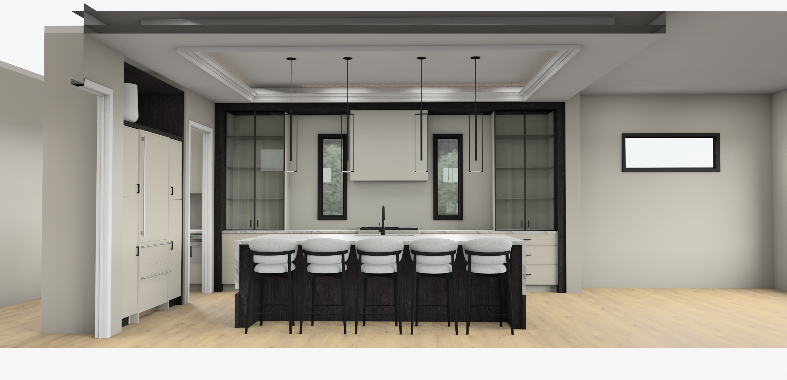 add white dishes in glass cabients with interior lighting