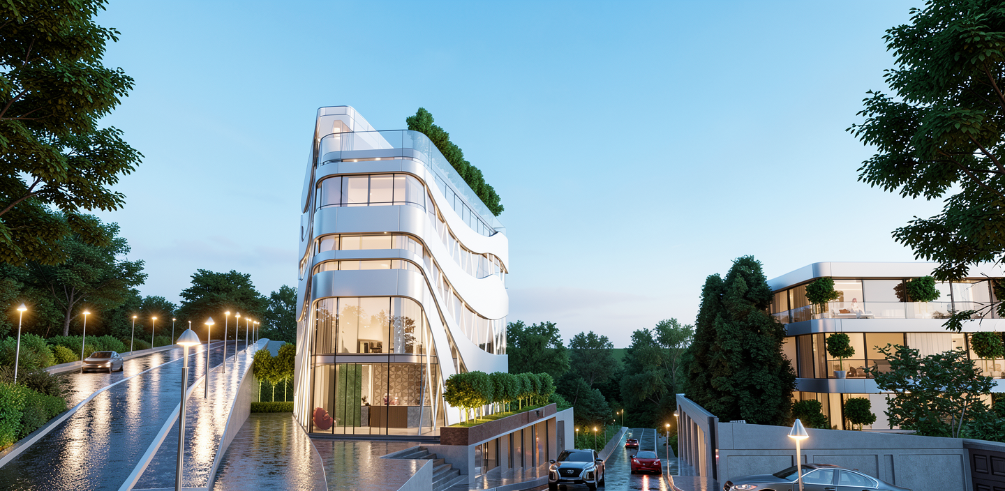 exterior shot render a scene with the original point of view using the moodboard reference for building details