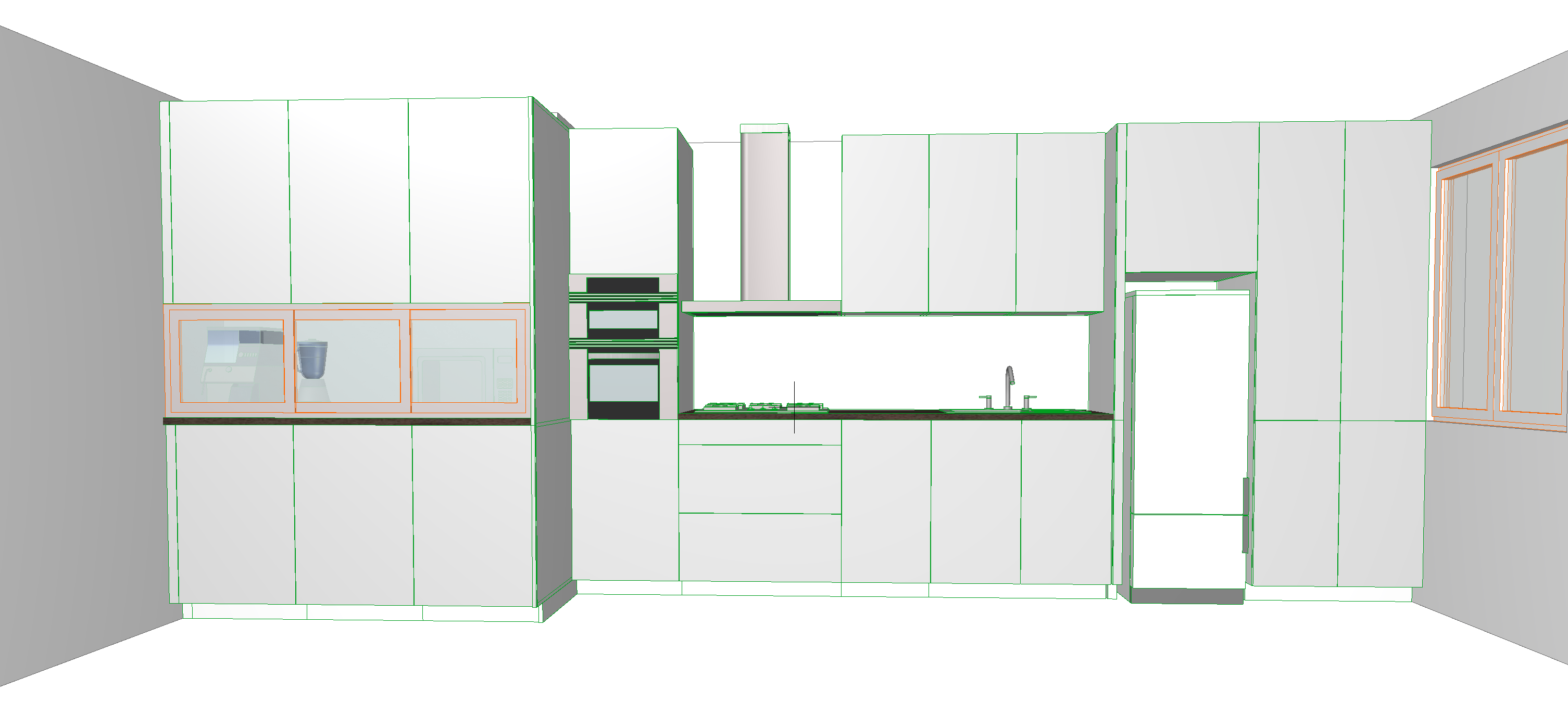 render a modern kitchen with high gloss handleless cabinets in soft ivory tone overall look should be sleek glossy modern with warm lighting highlighting reflections flooring should be white marble window profiles white in colour the counter should be in light colours add some decorative objects on the counter
