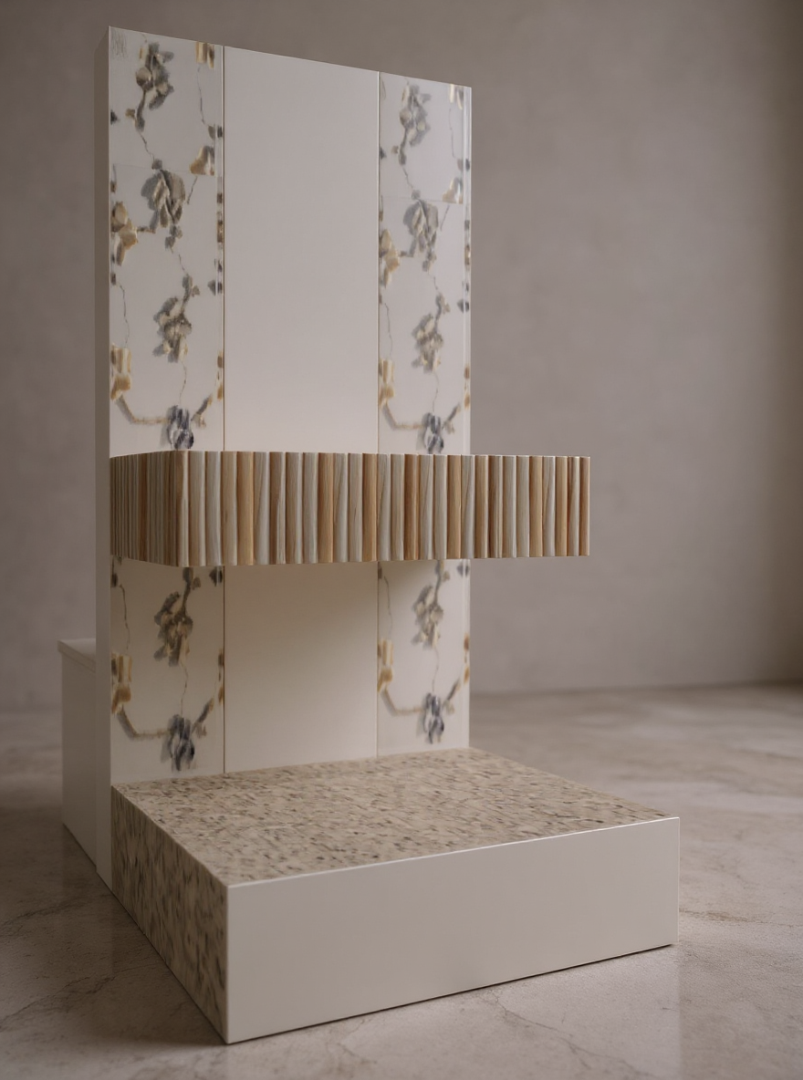 brushed brass instead of gold make flooring ceramic wood plank texture add nice lights under add sunlight