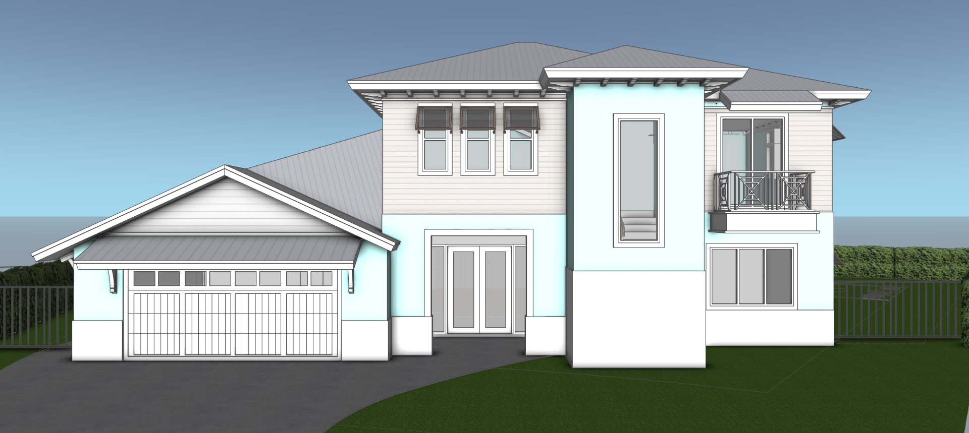 high quality photorealistic image with a modern two story house with elegant design featuring light blue exterior walls and siding the roof is a sleek gray metal providing a contemporary touch the garage door blends seamlessly with the fa ade painted in a crisp white with glass windows and doors are highlighted with simple white trim a neatly manicured lawn surrounds the house florida suburban adding vibrant green hues the sky above is clear with a soft gradient of blue and clouds creating a serene and inviting atmosphere the railing in white