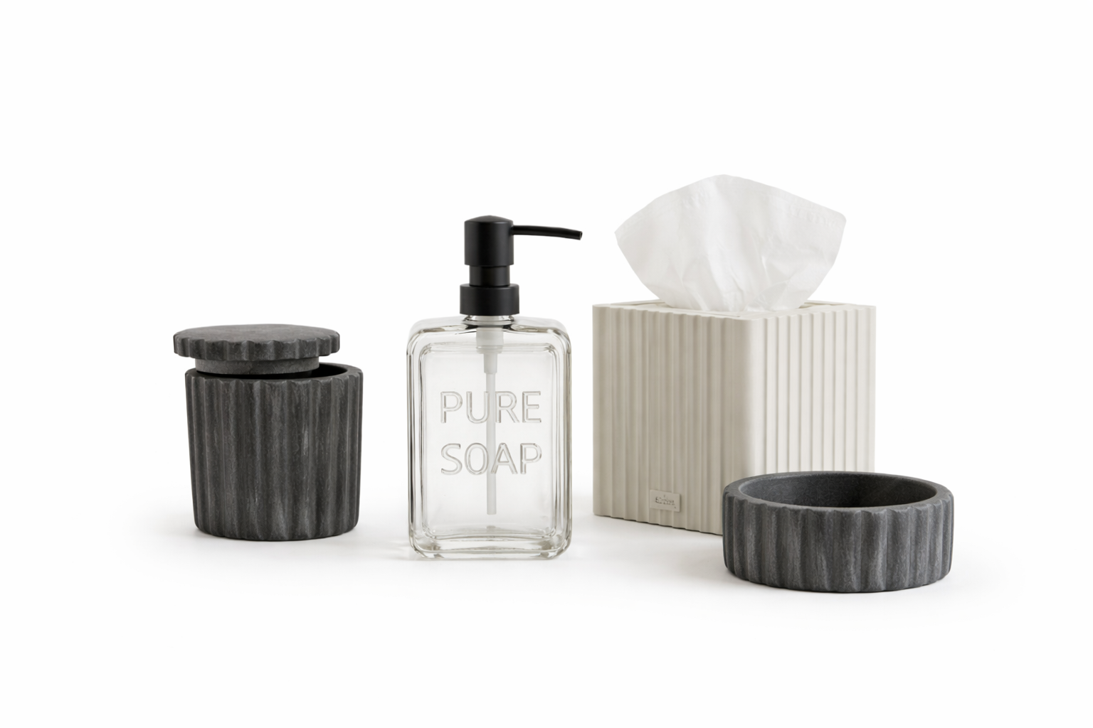 place these items on a vanity counter in a bathroom close up shot not full room image