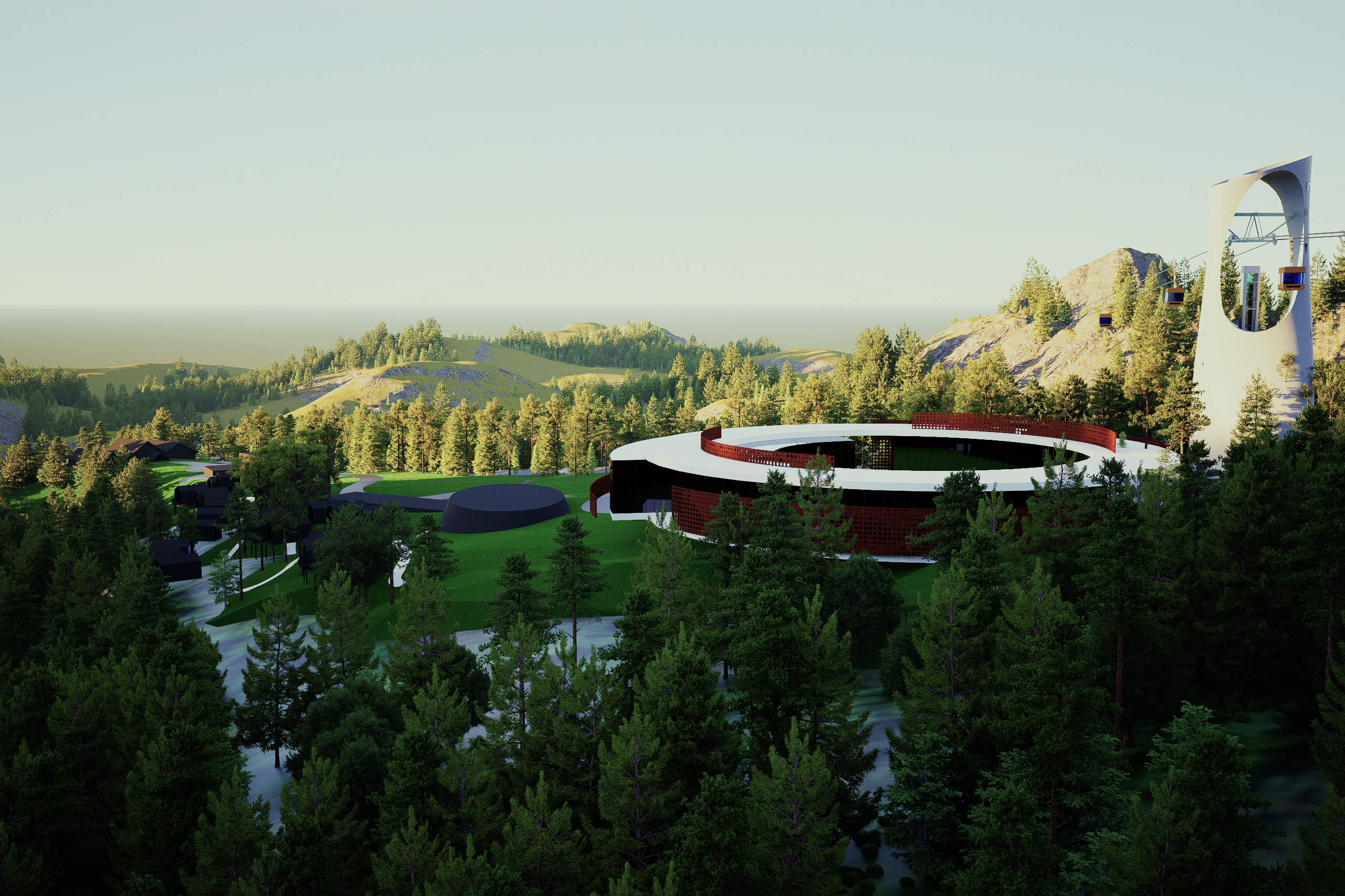 lots of tall pine trees and evergreens buildings should have a soft wood finish buildings should emit subtle warm lights