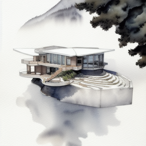 architectural watercolor rendering of a small contemporary research station perched on a rocky cliff structure made of warm wood black steel and glass precise and realistic architectural detailing cantilevered over stone terrain supported by steel beams surrounded by mountain pines and mist below rendered with crisp building geometry and realistic materials background and edges dissolve into loose watercolor washes and white paper edges not full bleed with soft unfinished fade around the image visible pencil and ink linework with light technical annotations artistic yet grounded balance of precision and painterly abstraction calm morning light concept architectural visualization style