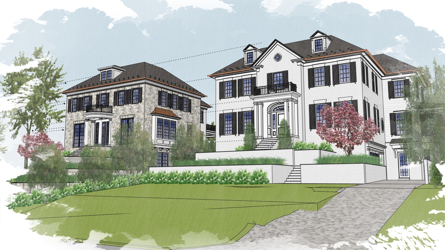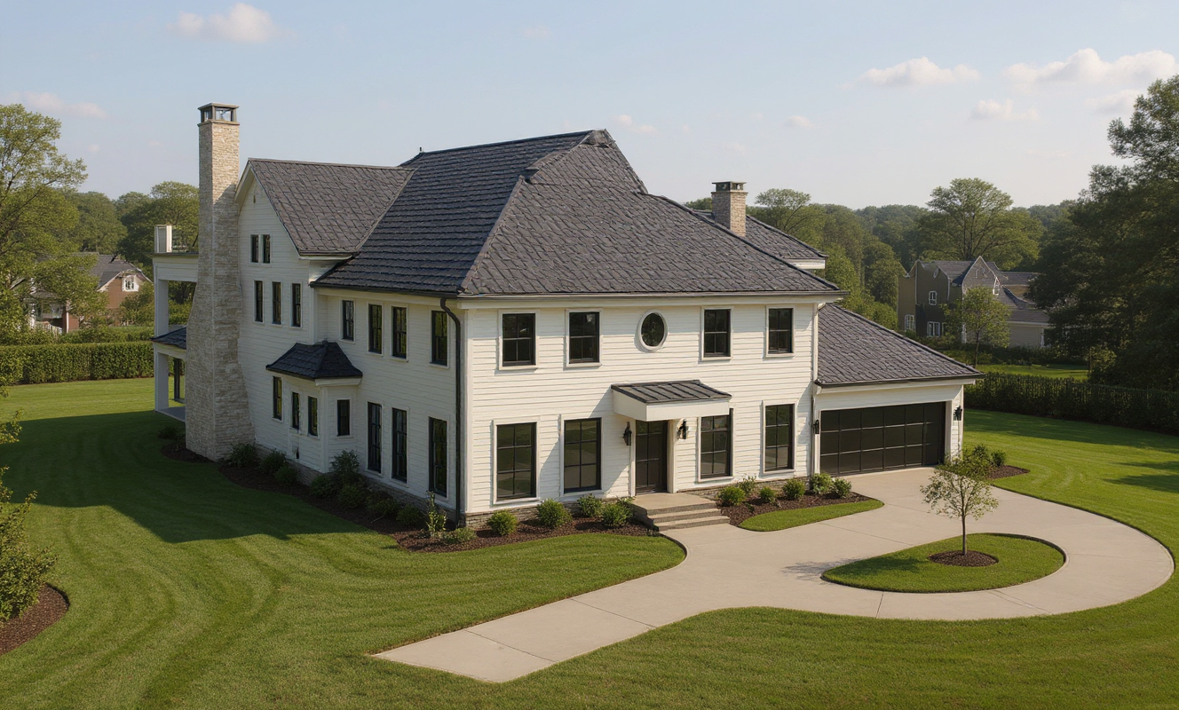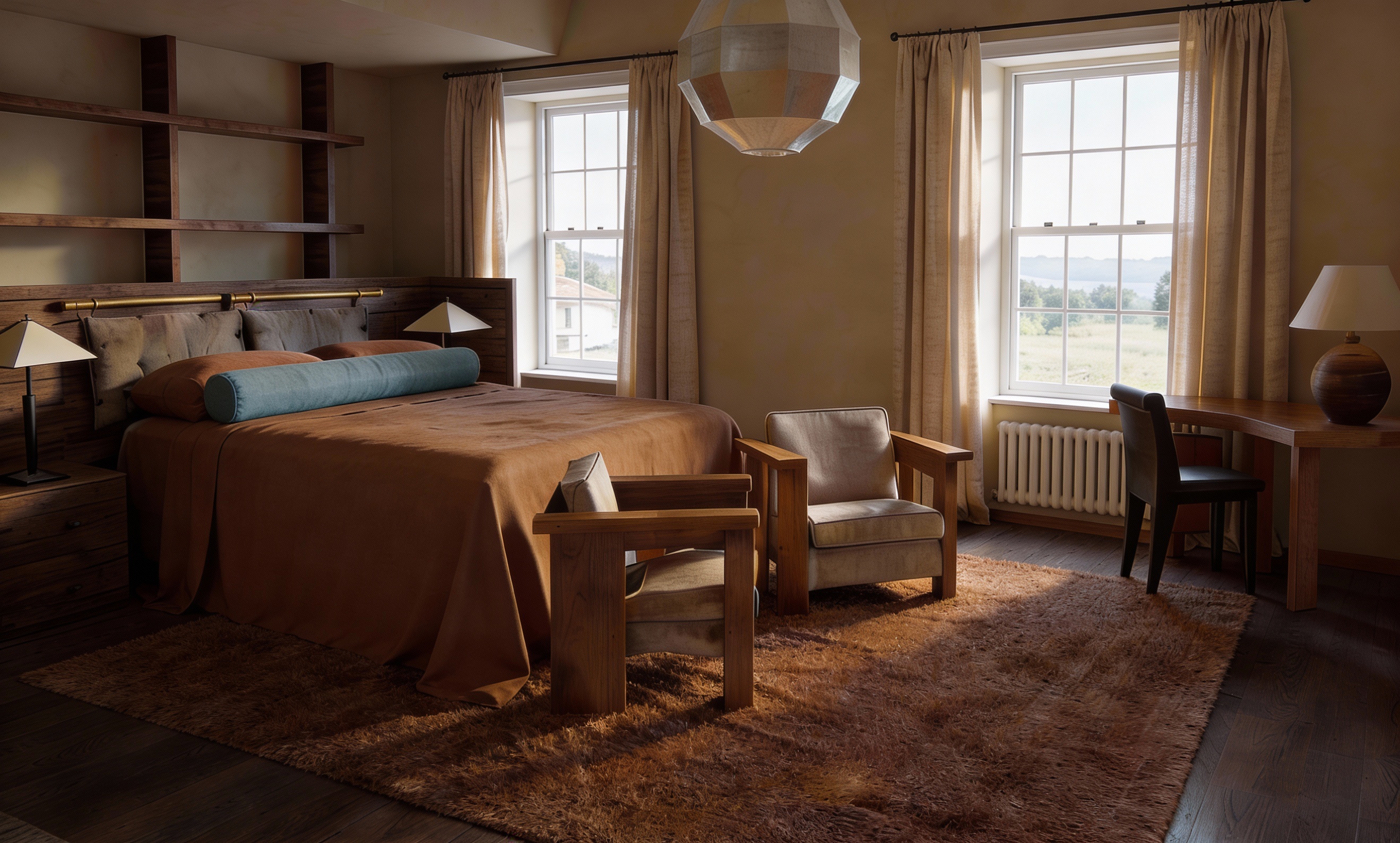 render to make look realistic and have it be a nighttime shot with soft warm light coming from windows soft sunset in background