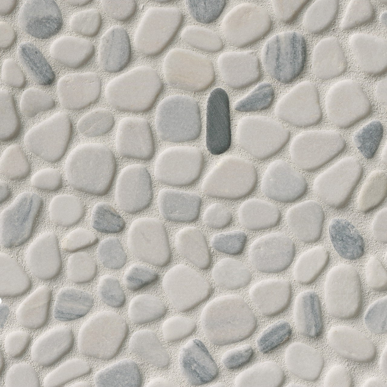 modernist exterior shot a mosaic pebble tile composed of smooth rounded stones in natural shades of white light gray and soft bluish gray the pebbles vary slightly in size and shape creating an organic irregular pattern they are set closely together with fine grout lines in between giving the surface a natural yet refined appearance the finish has a tactile stone like quality that evokes the look of riverbed pebbles arranged into a harmonious mosaic architecture