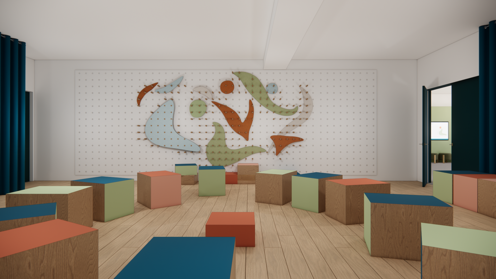 transform the provided interior image into a high end photorealistic architectural render this is a strict image to image refinement do not alter the design keep everything exactly identical to the reference image design geometry lock same spatial configuration same proportions and scale same furniture shapes geometry and positions same ceiling height 10 feet add realistic frame to all doors the same color as the door on the image no objects moved resized redesigned recolored replaced or reinterpreted material consistency lock use exactly the same materials colors textures and finishes as the reference image no variation no reinterpretation no color shift no scale change flooring wood as suggest on the image same tint orientation and grain walls painted gypsum with same color as suggested colors details on the wall keep the same color but give them a felter texture wooden block color is painted on the block height of the big block is 18 inch ceiling smooth painted gypsum add a slight amount of theatre lighting and equipment on the ceiling add recessed white ceiling light fixtures total amount of fixture around 20 centered in the room on both side of the white beam in the middle blue curtain must have a velvety feel floor trim must be small thin commercial vinyl trim that match exactly the color of the wall human presence controlled add couple of peoples sitting on the wooden block they must have a young artist look practicing theatre