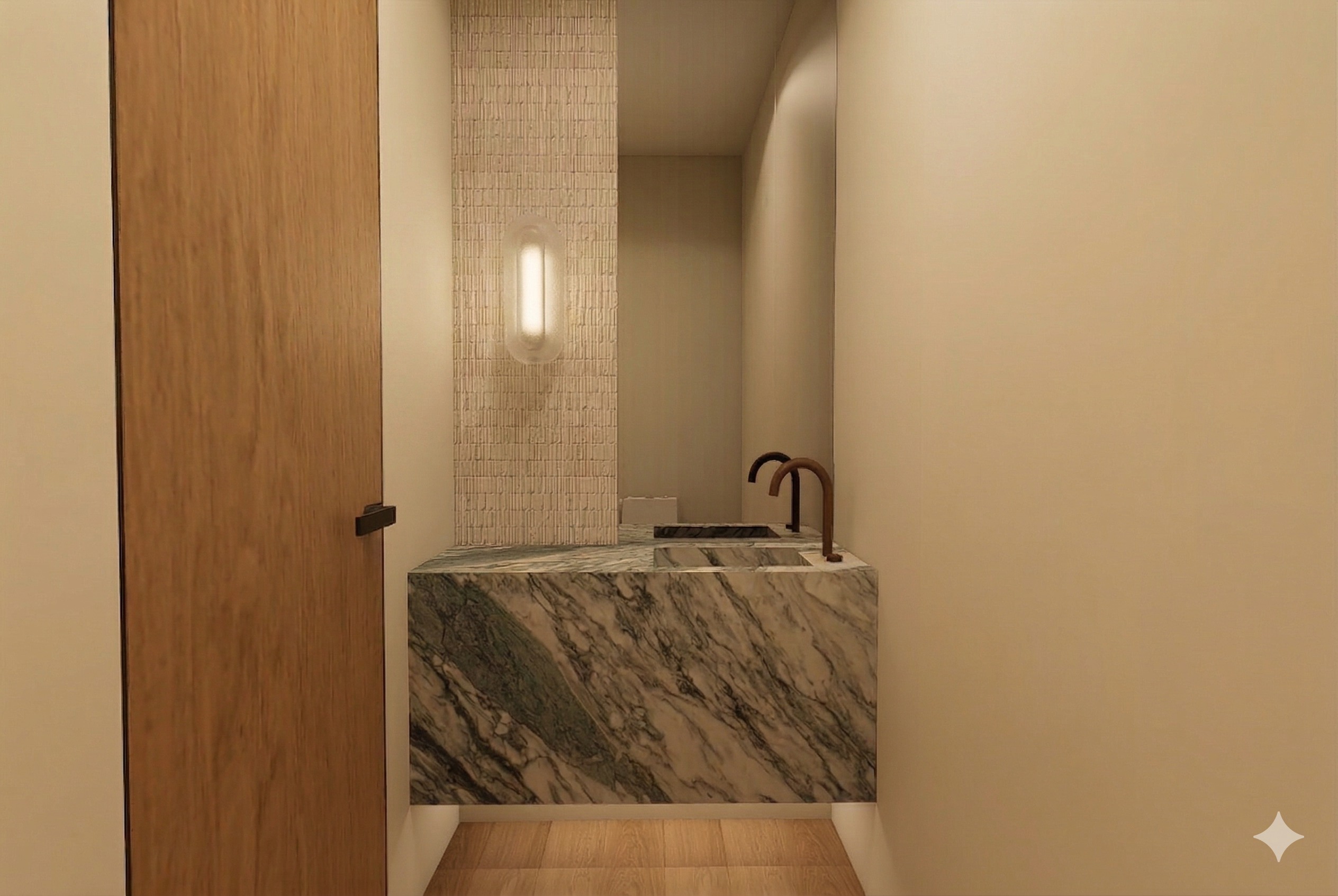 photorealistic interior render of a narrow modern powder room maintain exact geometry layout proportions and all existing materials from the model with no alterations or additions walls finished in warm creamy off white roman clay plaster with subtle texture feature wall behind vanity clad in vertically stacked small format textured tile in a light neutral tone floating monolithic stone vanity in heavily veined marble with dramatic diagonal veining integrated rectangular sink wall mounted faucet in dark aged bronze finish centered over sink tall narrow frameless borderless mirror mounted above vanity vertically aligned minimal wood door with flat panel and dark hardware on left side light natural wood flooring with soft matte finish lighting is soft warm and moody powder room ambiance hidden recessed ceiling lighting not visible plus a single vertical wall sconce centered on tile feature wall emitting diffused warm glow 2700k no additional light fixtures emphasize soft shadows indirect lighting and realistic light falloff no overexposure no harsh highlights camera positioned at human eye level 5 ft straight on view centered on vanity tight space perspective with slight wide angle lens approx 24 28mm equivalent without distortion materials must appear highly realistic with correct scale micro texture and subtle imperfections no added decor no styling objects no extra fixtures no changes to design style high end architectural digest minimalist warm refined moody