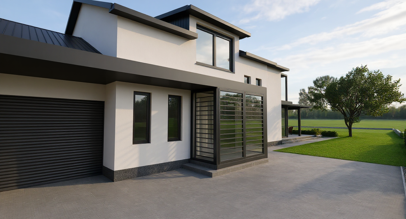 add glass doors to the walnut cabinet on the far right and make all the black cabinets hight gloss keep the walnut cabinets above the windows with solid walnut doors and add mood lighting inside the walnut glass cabinet on the right