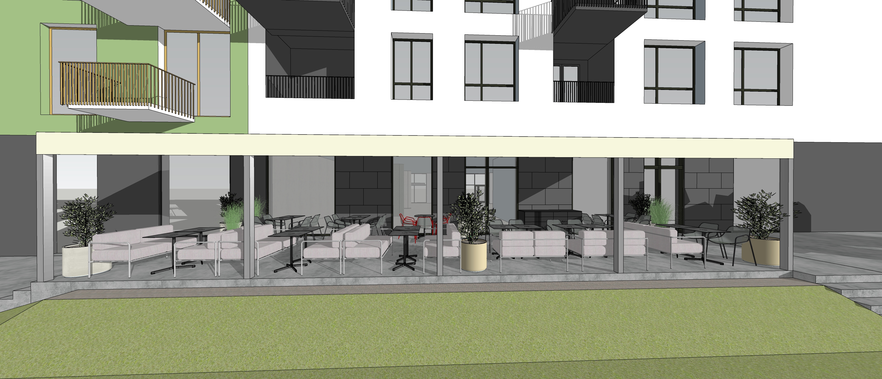 urban terrace caf stylish outdoor furniture natural human scale cozy atmosphere morning lighting warm ambient lights realistic shadows lifestyle architectural photography