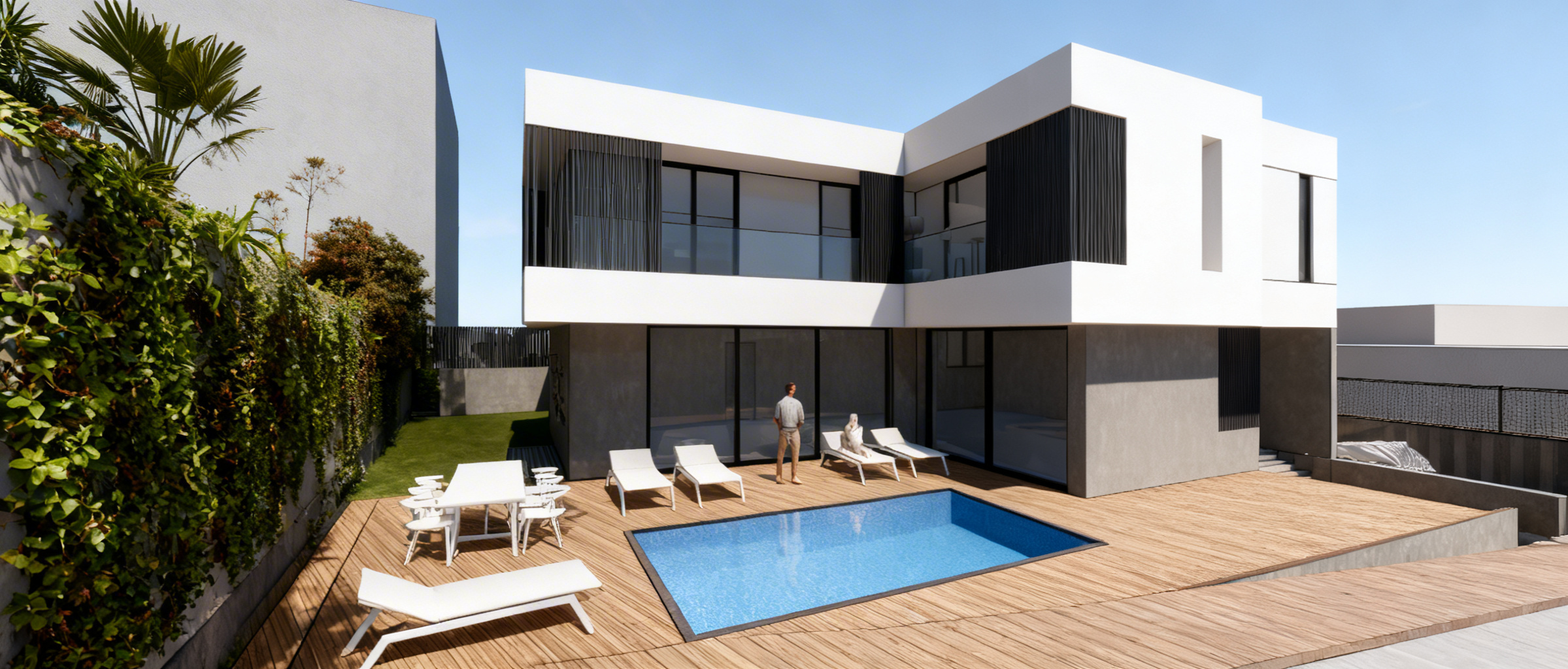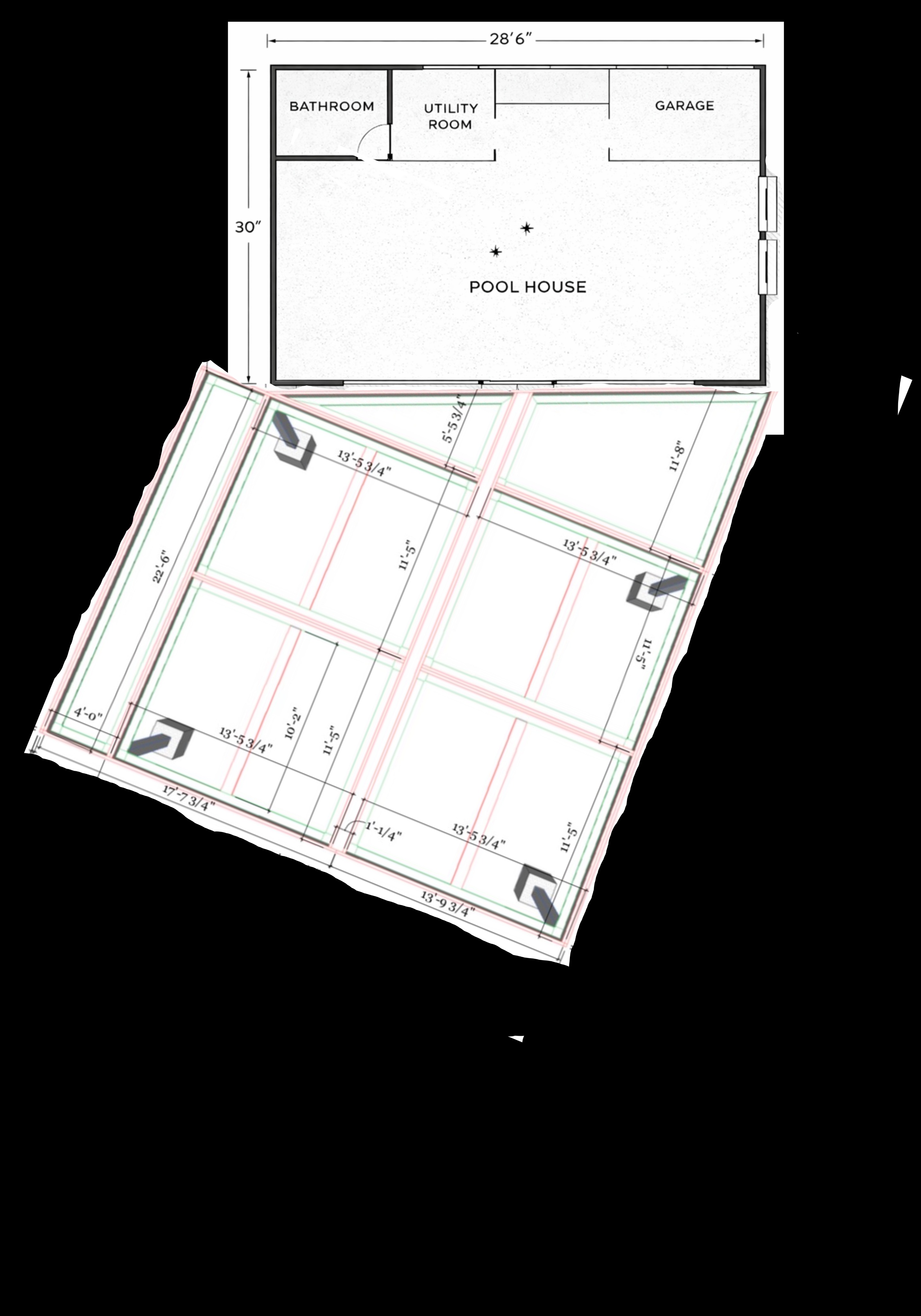 zaha hadid exterior shot create a clean architectural presentation sheet top a pool house floor plan 28 6 wide by 30 deep attached to the bottom wall of the pool house is a pergola structure important the pergola must keep its full original size and proportions approximately 48 wide by 36 deep do not scale or compress the pergola to match the pool house width the pergola is angled relative to the pool house and connects to only a portion of the bottom wall the pergola should extend beyond the width of the pool house naturally show structural posts beams and grid layout clearly and evenly spaced maintain accurate proportions for both structures independently use a clean black and white architectural drawing style suitable for printing no distortion no squeezing no floating elements architecture