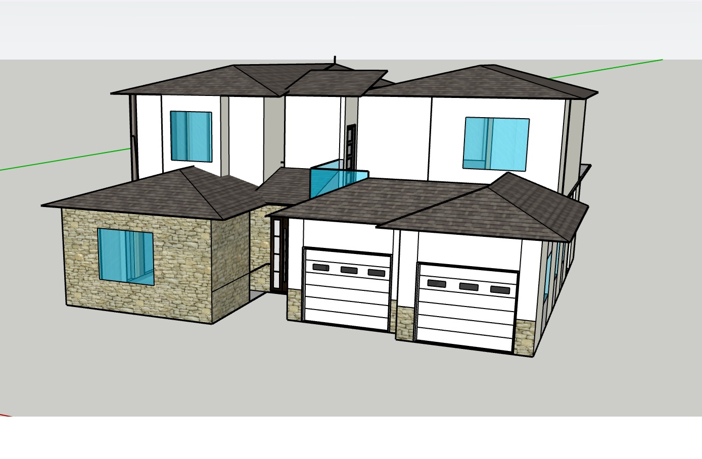 render a modern two story house in a serene suburban setting the structure has a mix of stone and white plaster walls with the stone sections in a warm sandy beige the roof is dark charcoal gray large windows with blue tinted glass reflect the surrounding greenery the garage doors are white with subtle gray paneling surround the house with a lush garden vibrant green grass and colorful flowers set under a clear bright blue sky during a sunny day creating a peaceful and welcoming atmosphere architecture