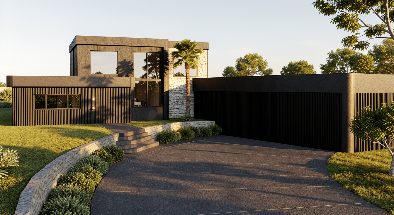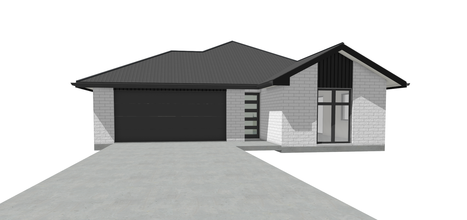 white brick black wood with a concrete driveway and fencing short grass halswell new zealand