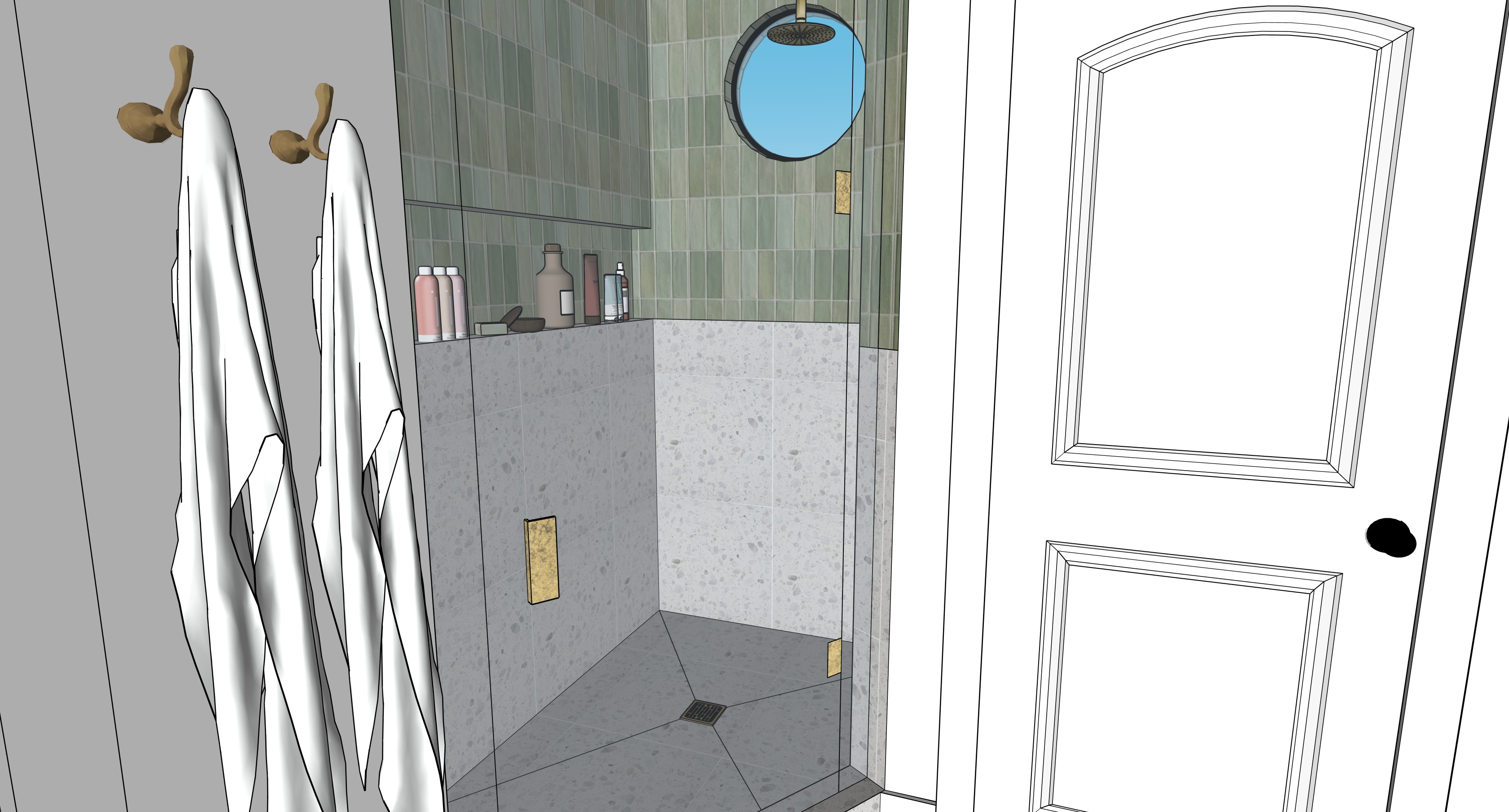 a modern bathroom with green tiled shower walls white marbled gray floor tiles brass fixtures and a round blue tinted window add white towels hanging on an antique brass hook capture a serene spa like atmosphere with natural light softly illuminating the space