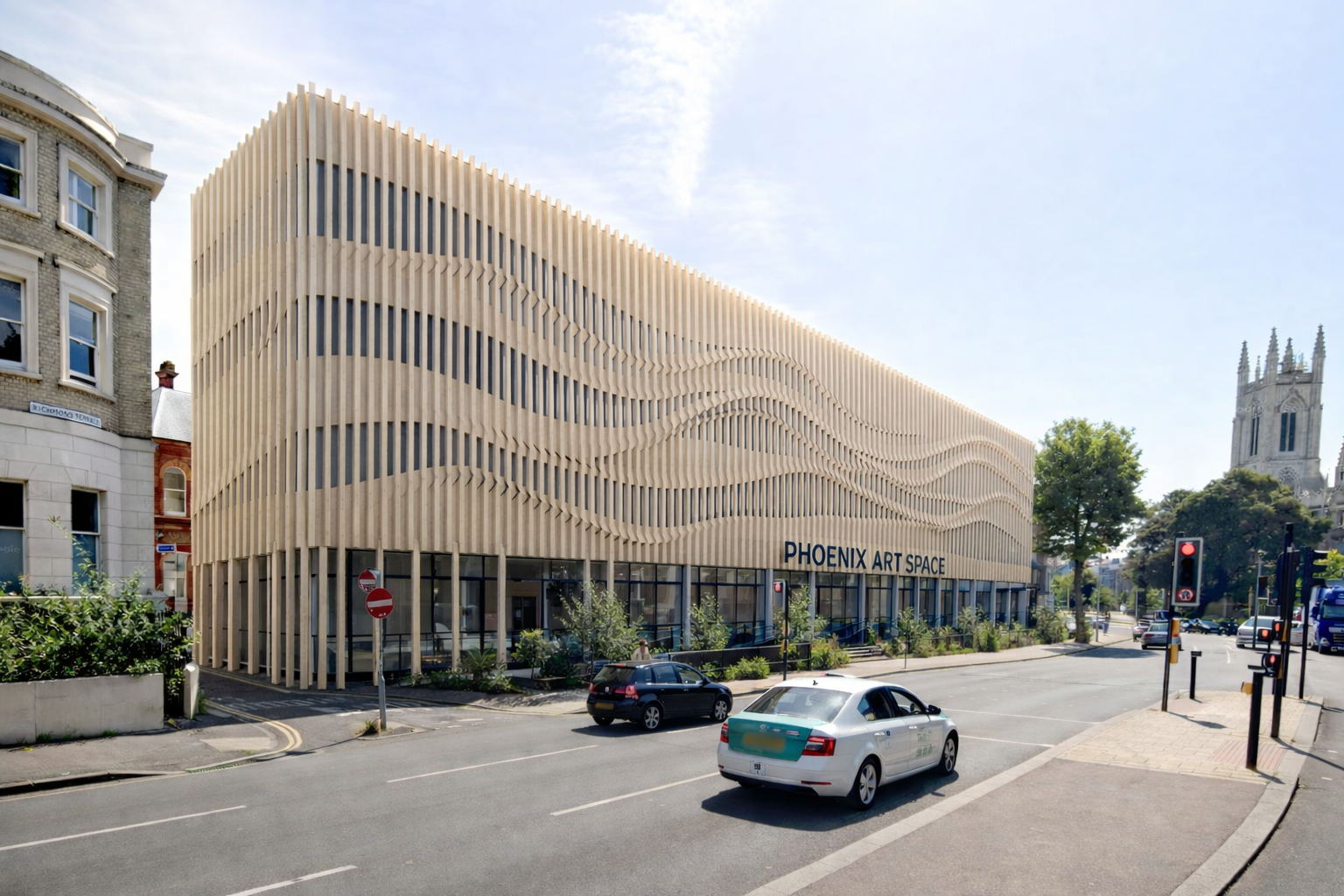make this much more photorealistic refine the vertical birch plywood fins to look more slender whilst making the overall facade sculptural pattern more in keeping with the numerations